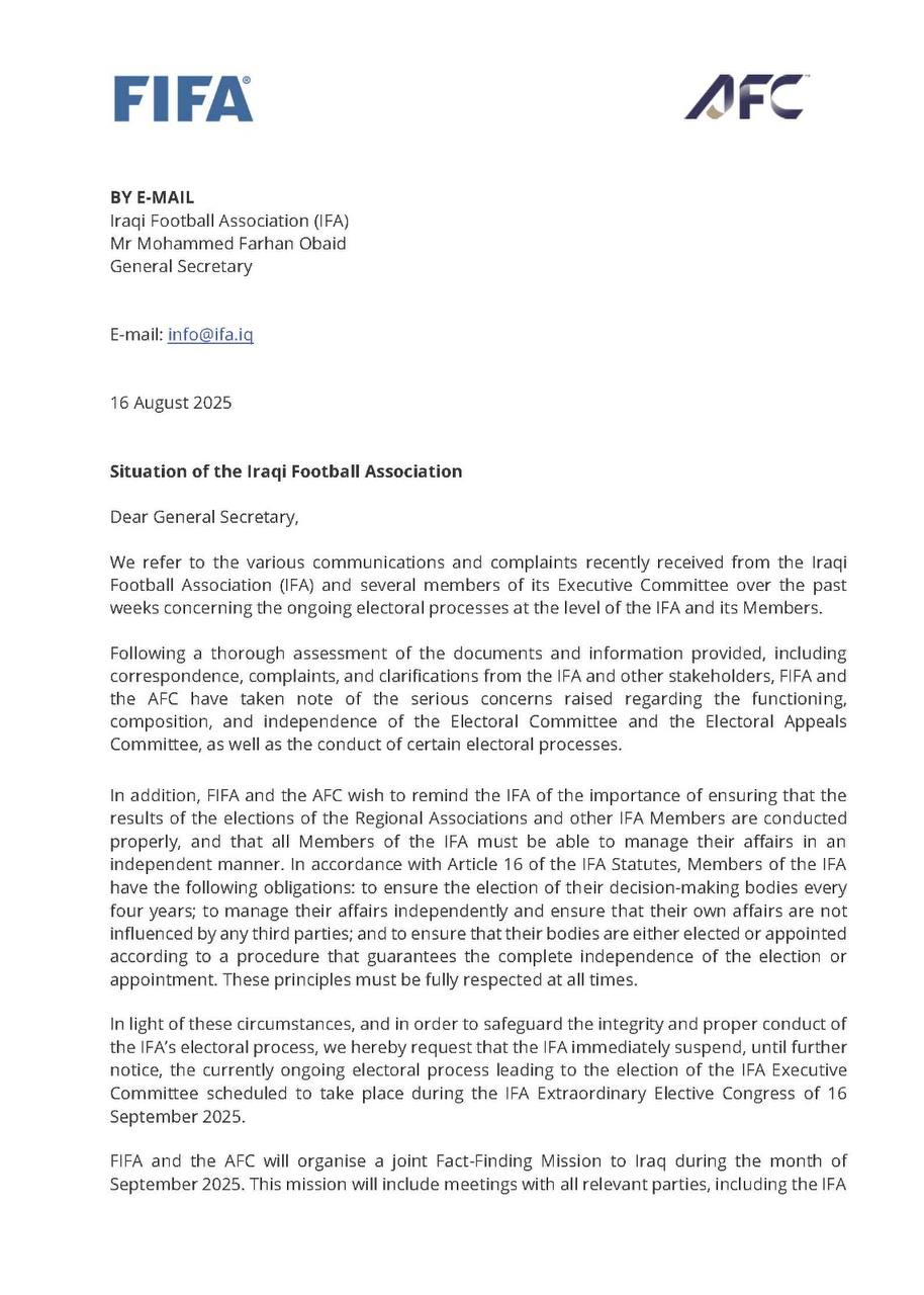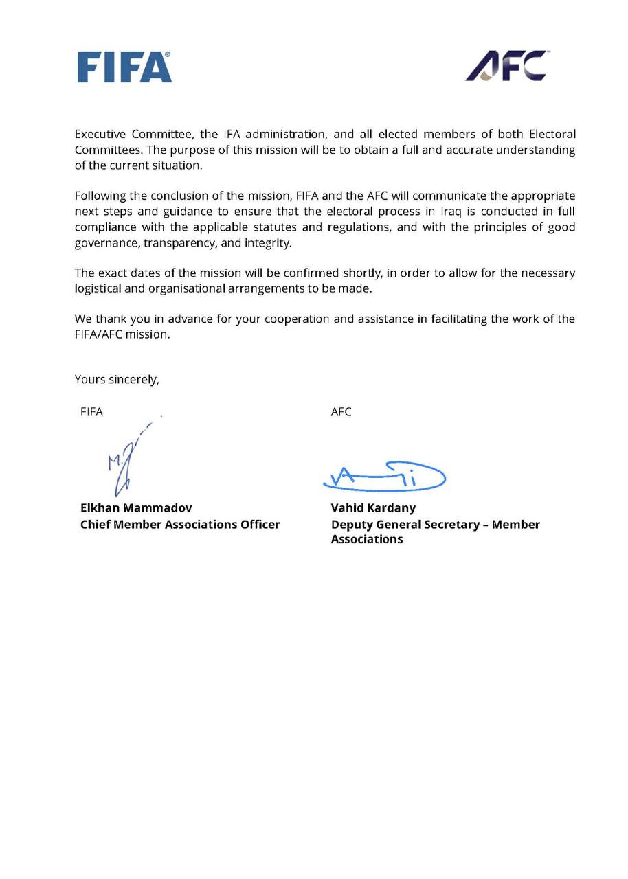 لە نووسراوەکەدا داوا لە فێدراسیۆنی تۆپی پێی عێراق کراوە، یاساکانی هەڵبژاردن بەتەواوی جێبەجێ بکات، هەروەها سەربەخۆیی و شەفافیەت بپارێزرێت و رێگە بە دەستوەردانی دەرەکیش نەدرێت.