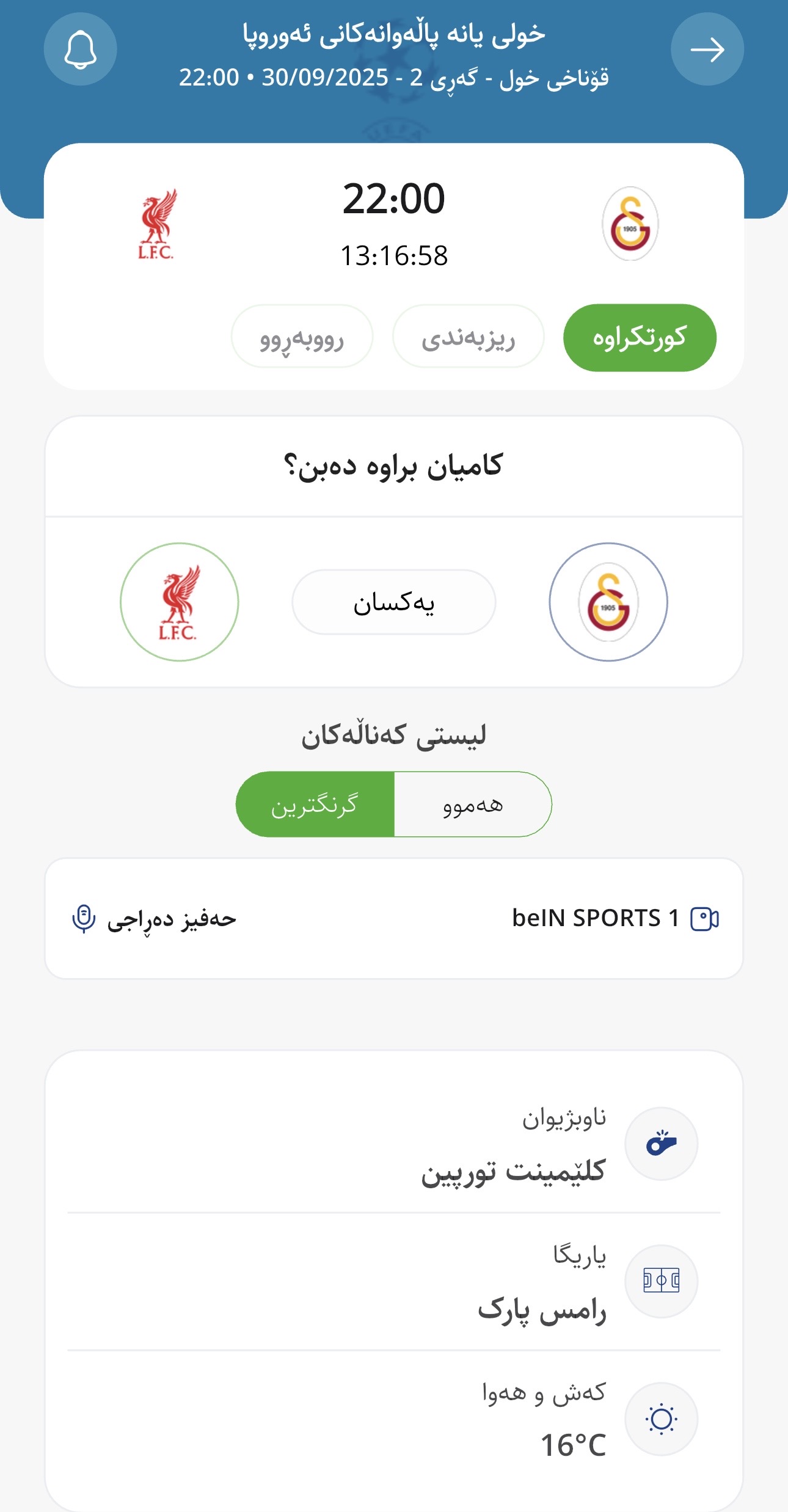 وا بڕیارە ئەمڕۆ سێشەممە كاتژمێر 22:00 بە كاتی كوردستان گاڵاتاسەرای لە یاریگای تایبەت بە خۆی میوانداری لیڤەرپوول بكات، لە میانی یارییەكانی گەڕی دووەمی قۆناخی خول – چامپیۆنزلیگ.