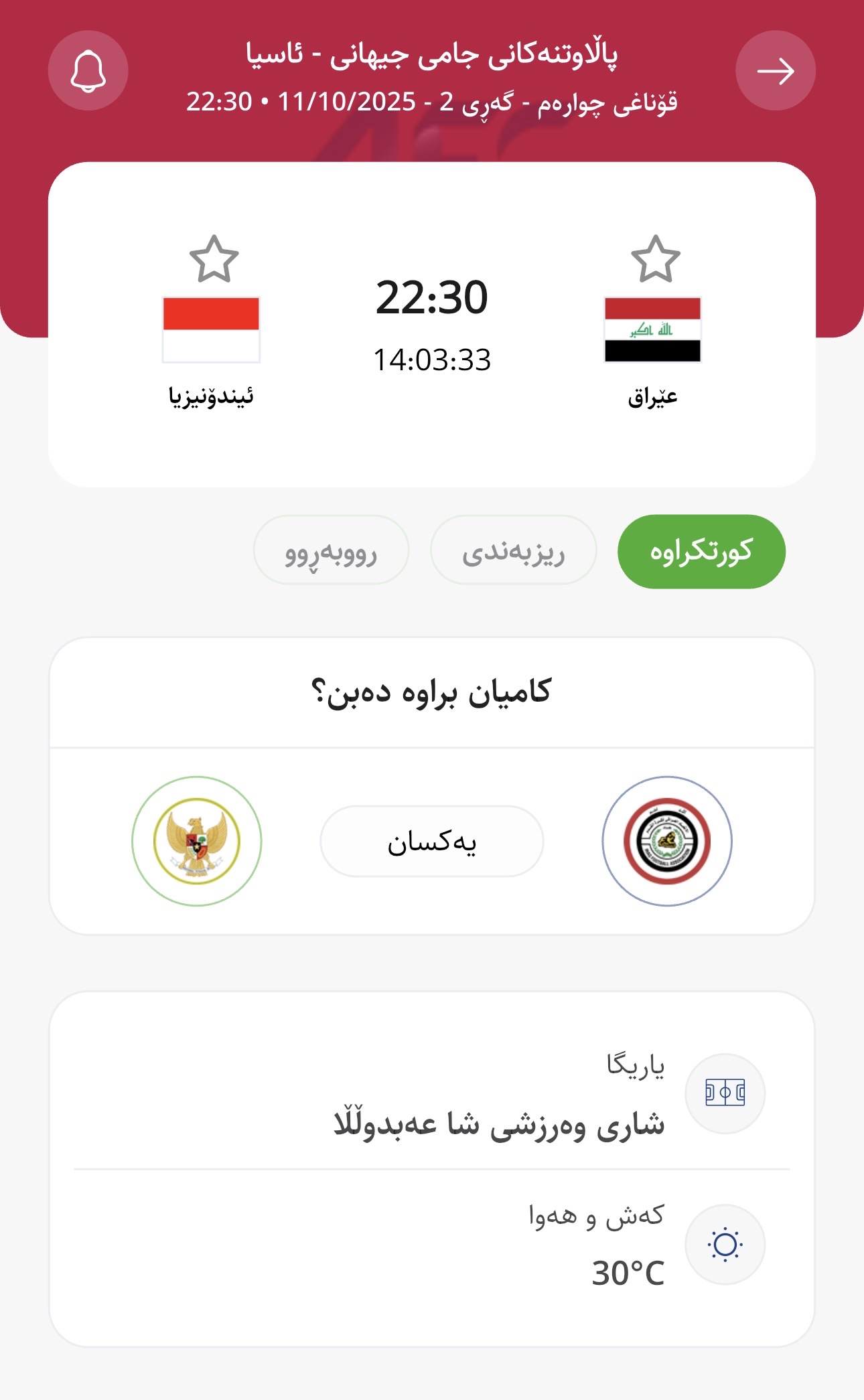 وا بڕیارە ئەمڕۆ شەممە كاتژمێر 22:30 بە كاتی كوردستان لە یاریگای شاری وەرزشی شا عەبدوڵا لە سعوودییە هەڵبژاردەی عێراق رووبەڕووی هەڵبژاردەی ئیندۆنیزیا ببێتەوە، لە میانی یارییەكانی قۆناخی پلەی ئۆف بۆ گەیشتن بە مۆندیالی 2026.