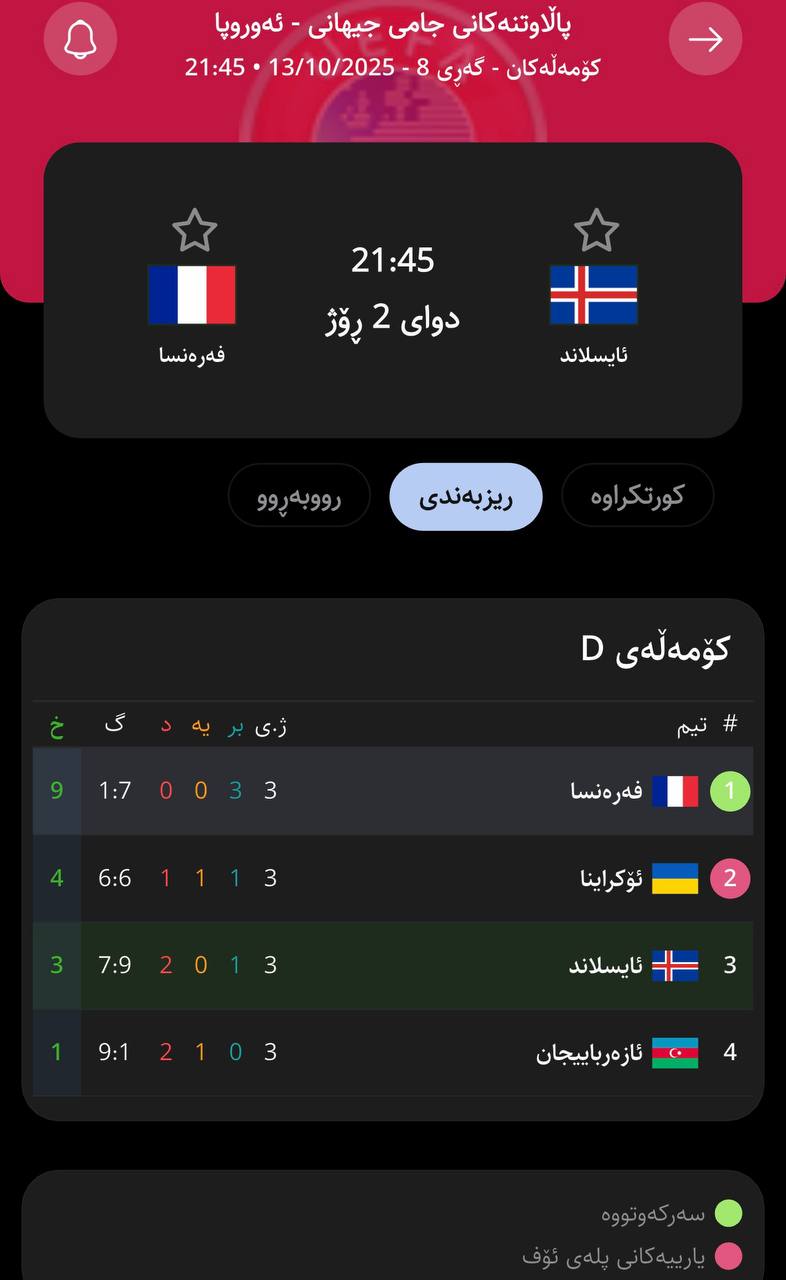 هەر لە یارییەکانی پاڵاوتنەکانی مۆندیال، دووشەممە 13ـی ئۆکتۆبەر، کاتژمێر 21:45 بەکاتی کوردستان، هەڵبژاردەی ئایسلاند میوانداری هەڵبژاردەی فەڕەنسا دەکات.