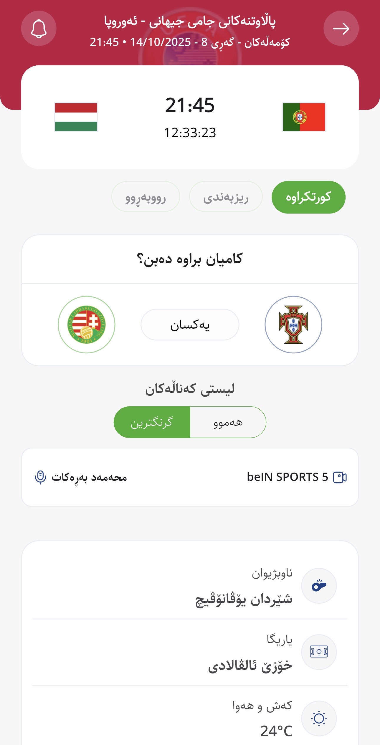 وا بڕیارە ئەمڕۆ سێشەممە كاتژمێر 21:45 بە كاتی كوردستان هەڵبژاردەی پۆرتوگال میوانداری هەڵبژاردەی هەنگاریا بكات، لە میانی یارییەكانی كیشوەری ئەوروپا بۆ گەیشتن بە مۆندیالی 2026.