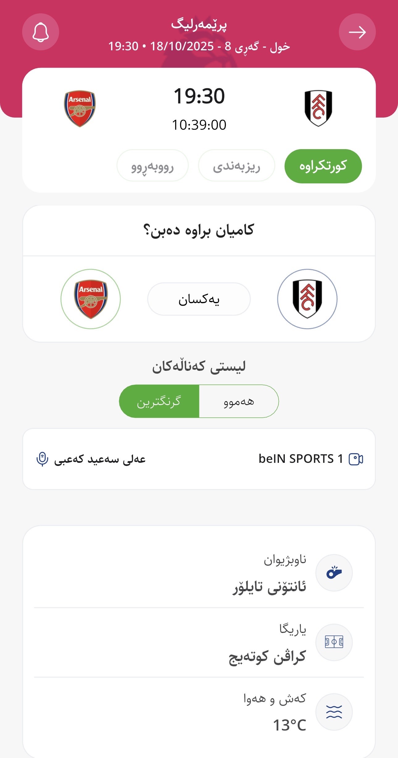 وا بڕیارە ئەمڕۆ شەممە كاتژمێر 19:30 فولهام لە یاریگای كراڤن كوتەیجی تایبەت بە خۆی میوانداری ئارسیناڵ بكات، لە میانی یارییەكانی گەڕی هەشتەمی پرێمەرلیگ.