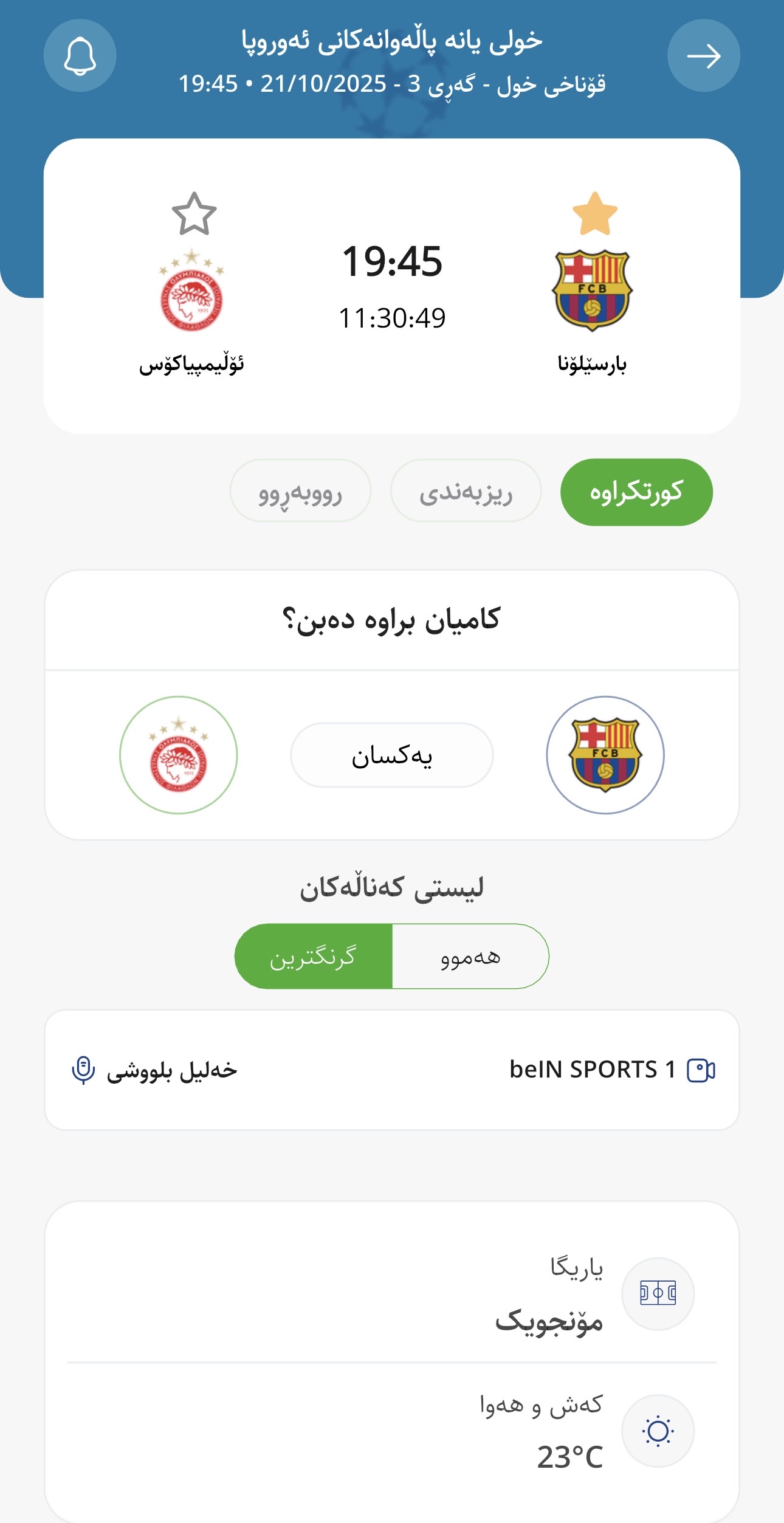 وا بڕیارە ئەمڕۆ سێشەممە كاتژمێر 19:45 بە كاتی كوردستان بارسێلۆنا لە یاریگای مۆنجویكی تایبەت بە خۆی میوانداری ئۆڵیمپیاكۆسی یۆنانی بكات، لە میانی یارییەكانی گەڕی سێیەمی قۆناخی خول چامپیۆنزلیگ.