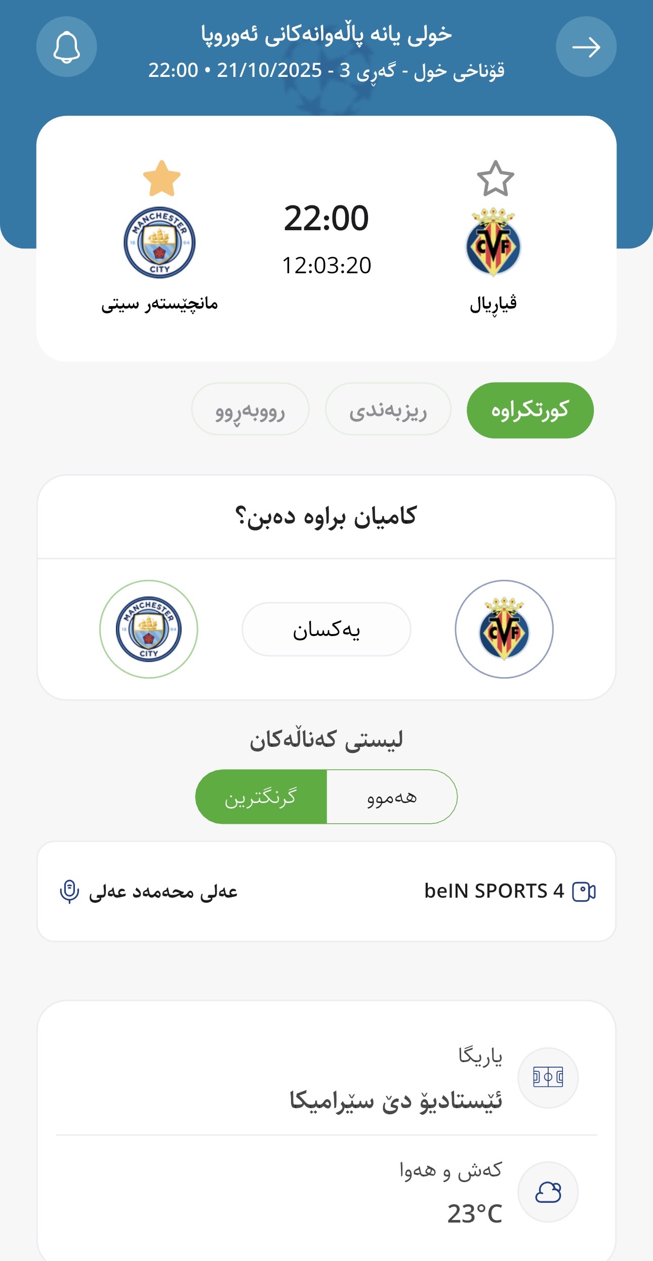 وا بڕیارە ئەمڕۆ سێشەممە كاتژمێر 22:00بە كاتی كوردستان ڤیاڕیال لە یاریگای تایبەت بە خۆی میوانداری مانچێستەر سیتی بكات، لە میانی یارییەكانی گەڕی سێیەمی قۆناخی خول – چامپیۆنزلیگ.