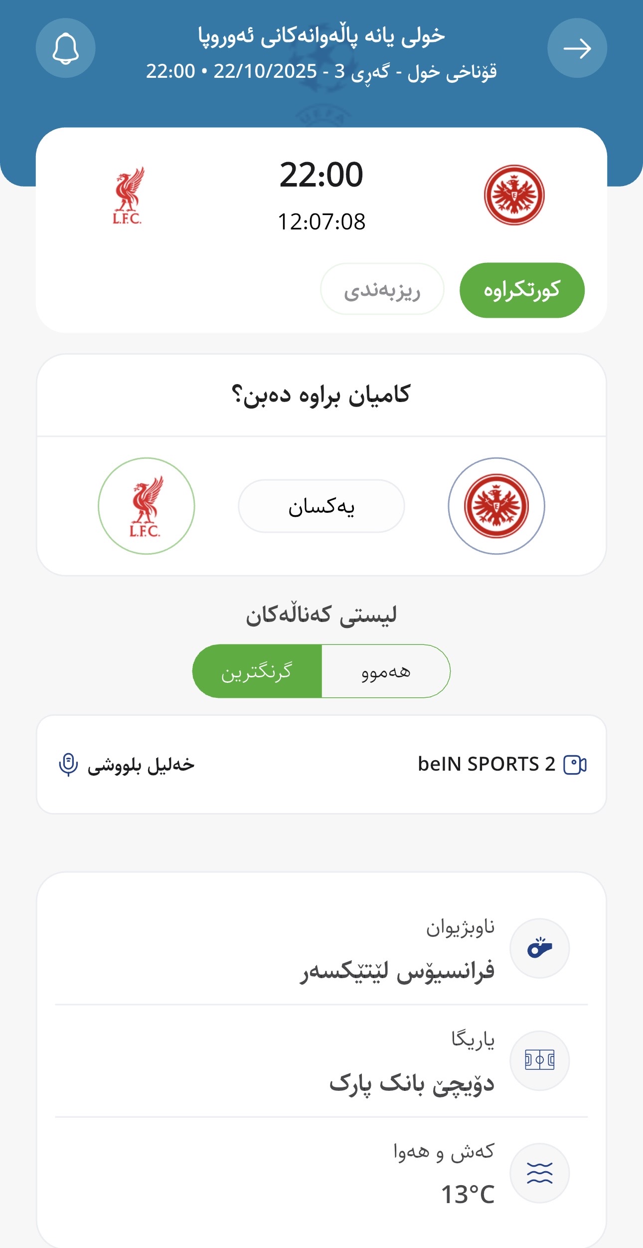 وا بڕیارە ئەمڕۆ چوارشەممە كاتژمێر 22:00 بە كاتی كوردستان ئێنتراخت فرانکفورت لە یاریگای خۆی میوانداری لیڤەرپوول بكات، لە میانی یارییەكانی گەڕی سێیەمی قۆناخی خول – چامپیۆنزلیگ.