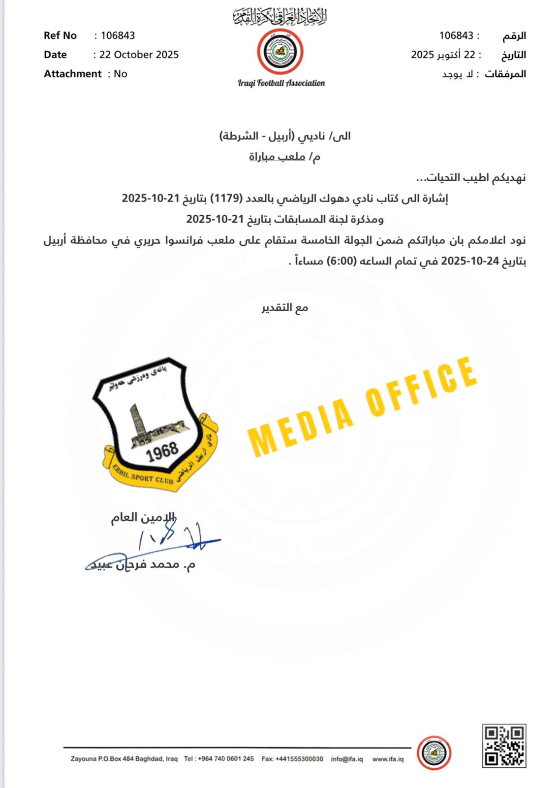 نووسراوەکە، کە واژۆی ئەمینداری گشتی یەکێتییەکە، محەمەد فەرحان عوبەیدی لەسەرە، ئاراستەی هەردوو یانەی هەولێر و شوڕتە کراوە و تێیدا هاتووە کە یارییەکەیان لە چوارچێوەی گەڕی پێنجەمی خولی ئەستێرەکانی عێراقدا لە هەولێر و له یاریگا فهڕهنسۆ دهكرێت.
