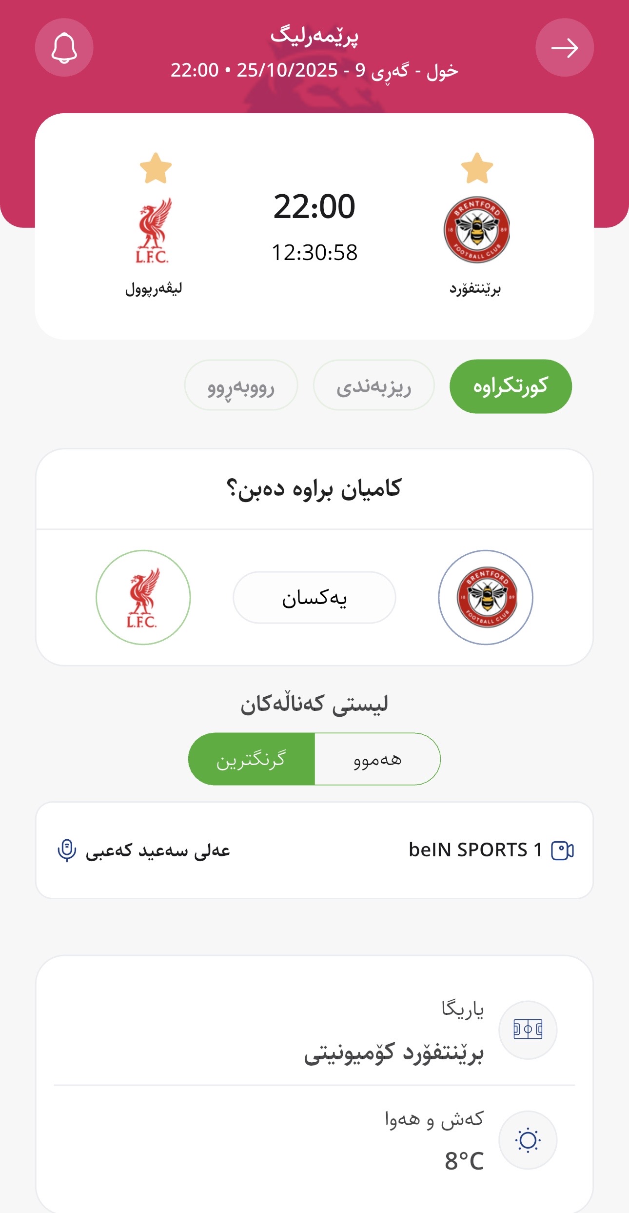 وا بڕیارە ئەمڕۆ شەممە كاتژمێر 22:00 بەكاتی كوردستان برێنتفۆرد لە یاریگای تایبەت بە خۆی میوانداری لیڤەرپوول بكات، لە میانی یارییەكانی گەڕی نۆیەمی پرێمەرلیگ.