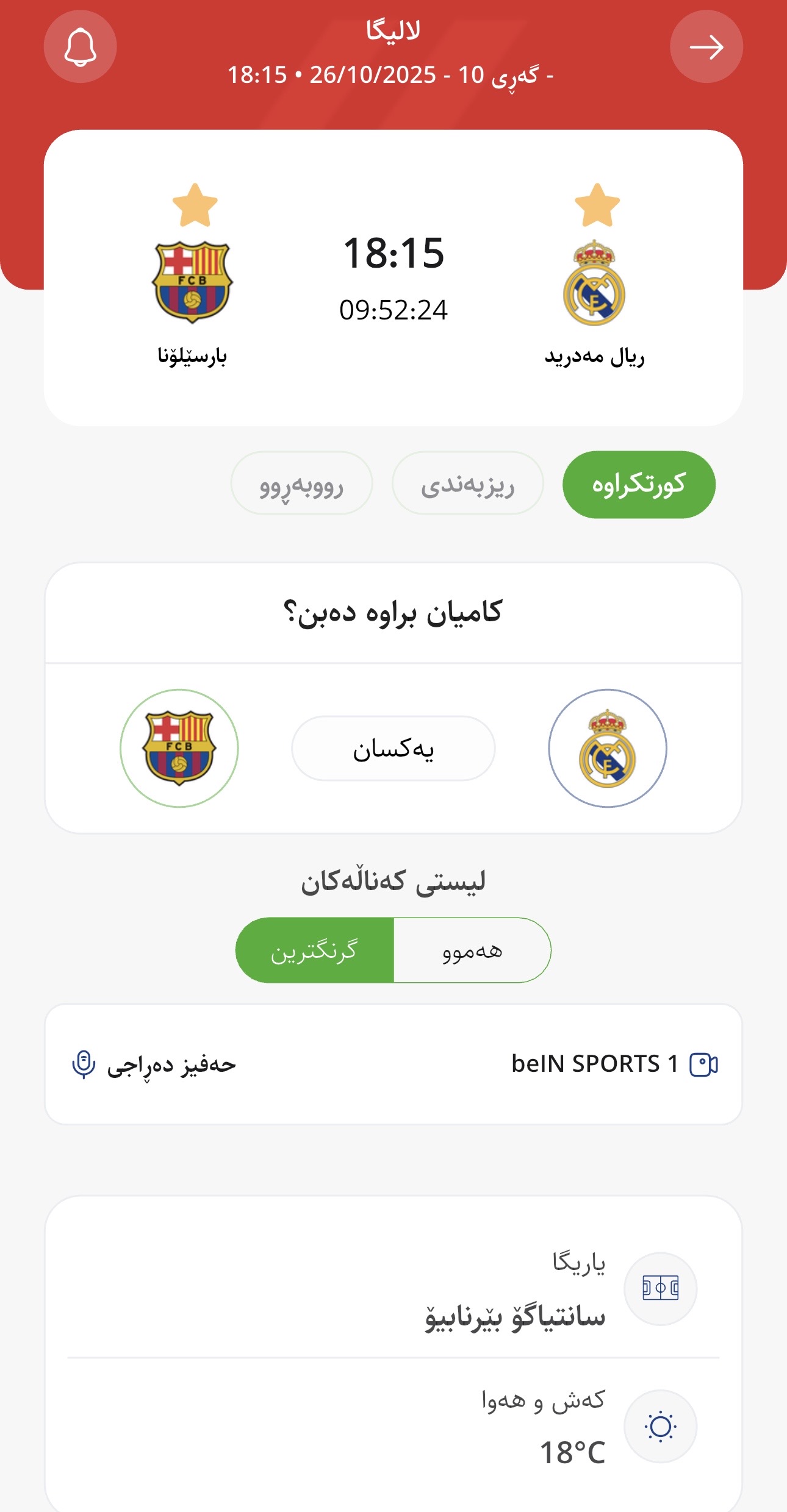 وا بڕیارە ئەمڕۆ یەكشەممە كاتژمێر 18:15 بە كاتی كوردستان ریال مەدرید لە یاریگای سانتیاگۆ بێرنابیۆی تایبەت بە خۆی میوانداری بارسێلۆنا بكات، لە میانی یارییەكانی گەڕی دەیەمی لالیگای ئیسپانیا.