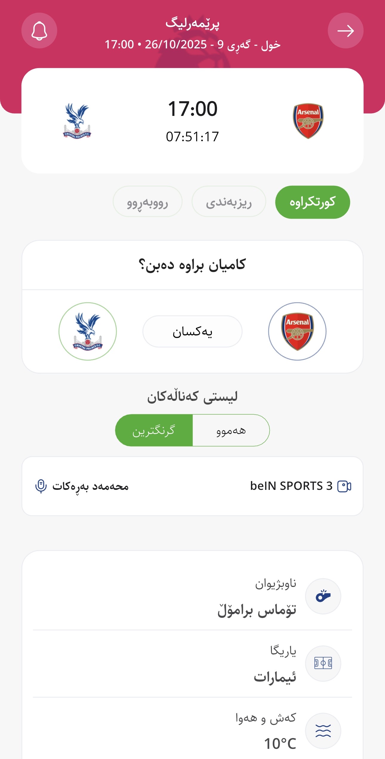 وا بڕیارە ئەمڕۆ یەكشەممە كاتژمێر 17:00 بە كاتی كوردستان ئارسیناڵ لە یاریگای ئیماراتی تایبەت بە خۆی میوانداری كریستاڵ پاڵاس بكات، لە میانی یارییەكانی گەڕی نۆیەمی پرێمەرلیگ.