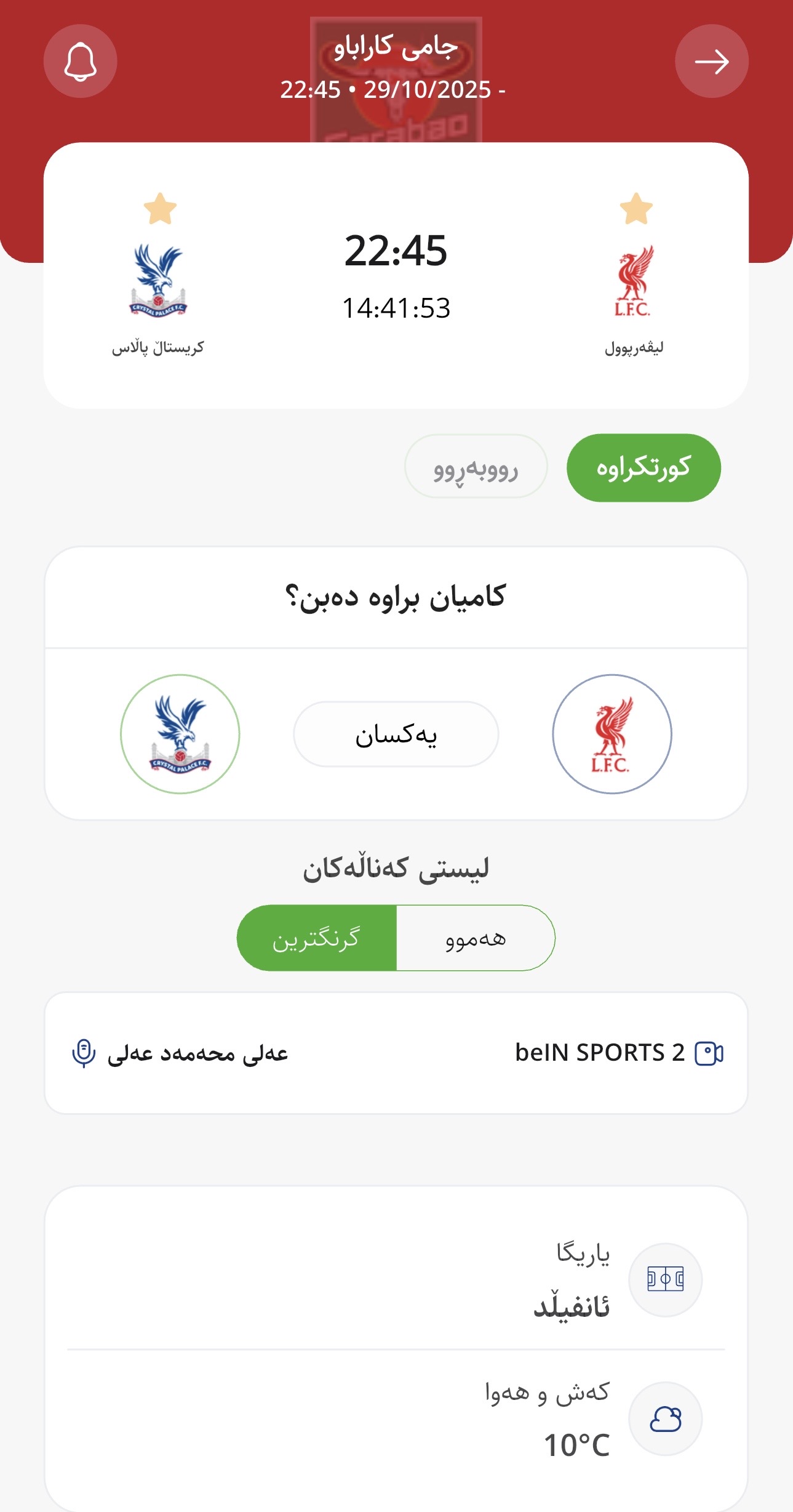 وا بڕیارە ئەمڕۆ چوارشەممە كاتژمێر 22:45 لیڤەرپوول لە یاریگای ئانفیڵدی تایبەت بە خۆی میوانداری كریستاڵ پاڵاس بكات، لە میانی یارییەكانی قۆناخی چوارەمی جامی كاراباو.