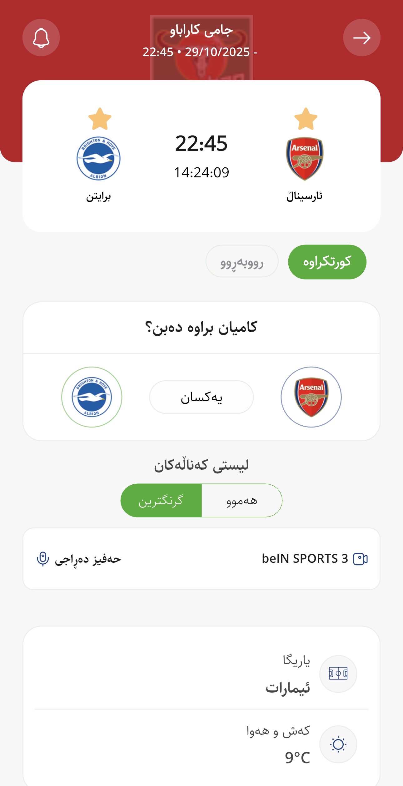 وا بڕیارە ئەمڕۆ چوارشەممە كاتژمێر 22:45 ئارسیناڵ لە یاریگای ئیماراتی تایبەت بە خۆی میوانداری برایتن بكات، لە میانی یارییەكانی قۆناخی چوارەمی جامی كاراباو.
