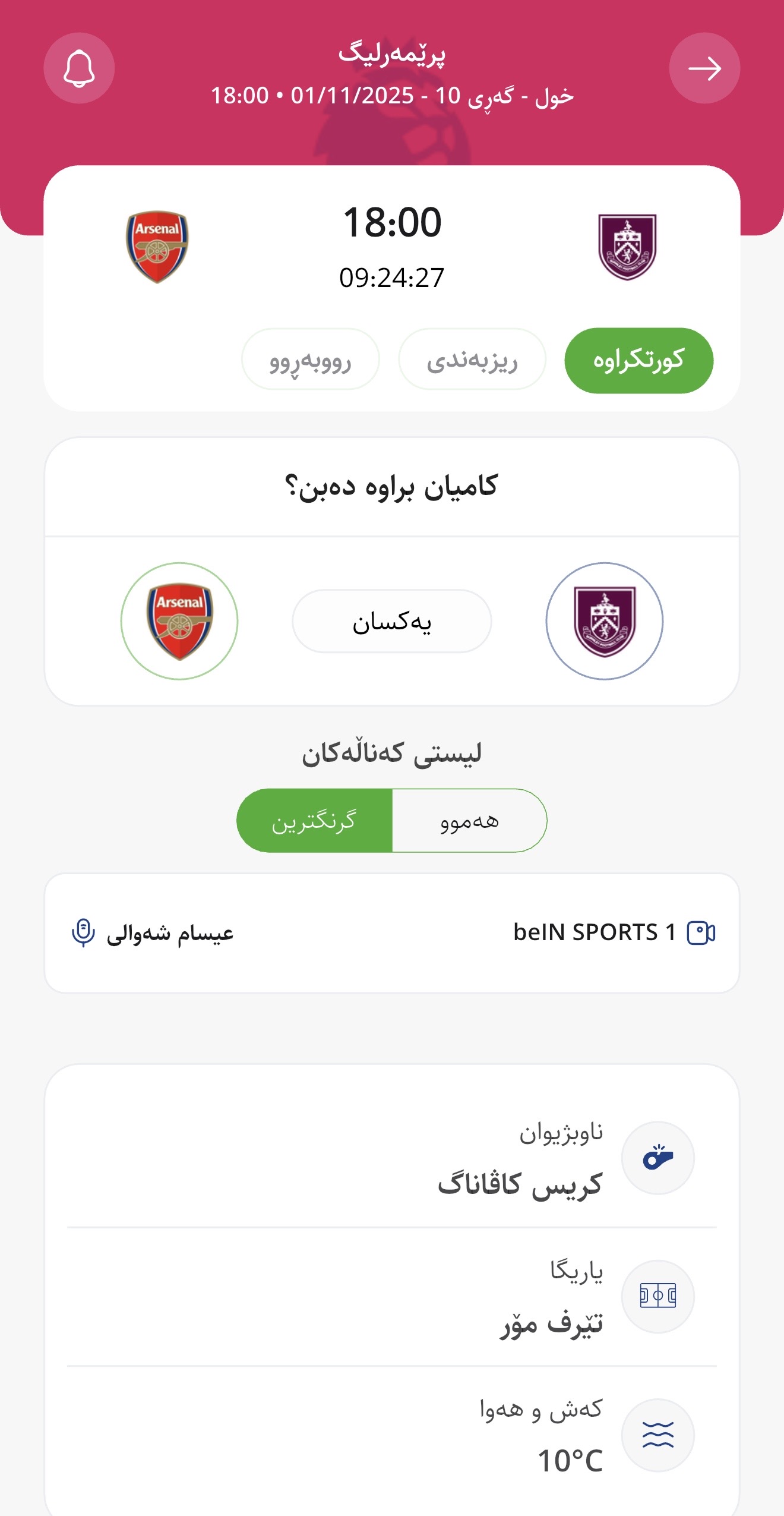 وا بڕیارە ئەمڕۆ شەممە كاتژمێر 18:00 بە كاتی كوردستان بێرنلی لە یاریگای خۆیدا میوانداری ئارسیناڵ بكات، لە میانی یارییەكانی گەڕی دەیەمی پرێمەرلیگ.
