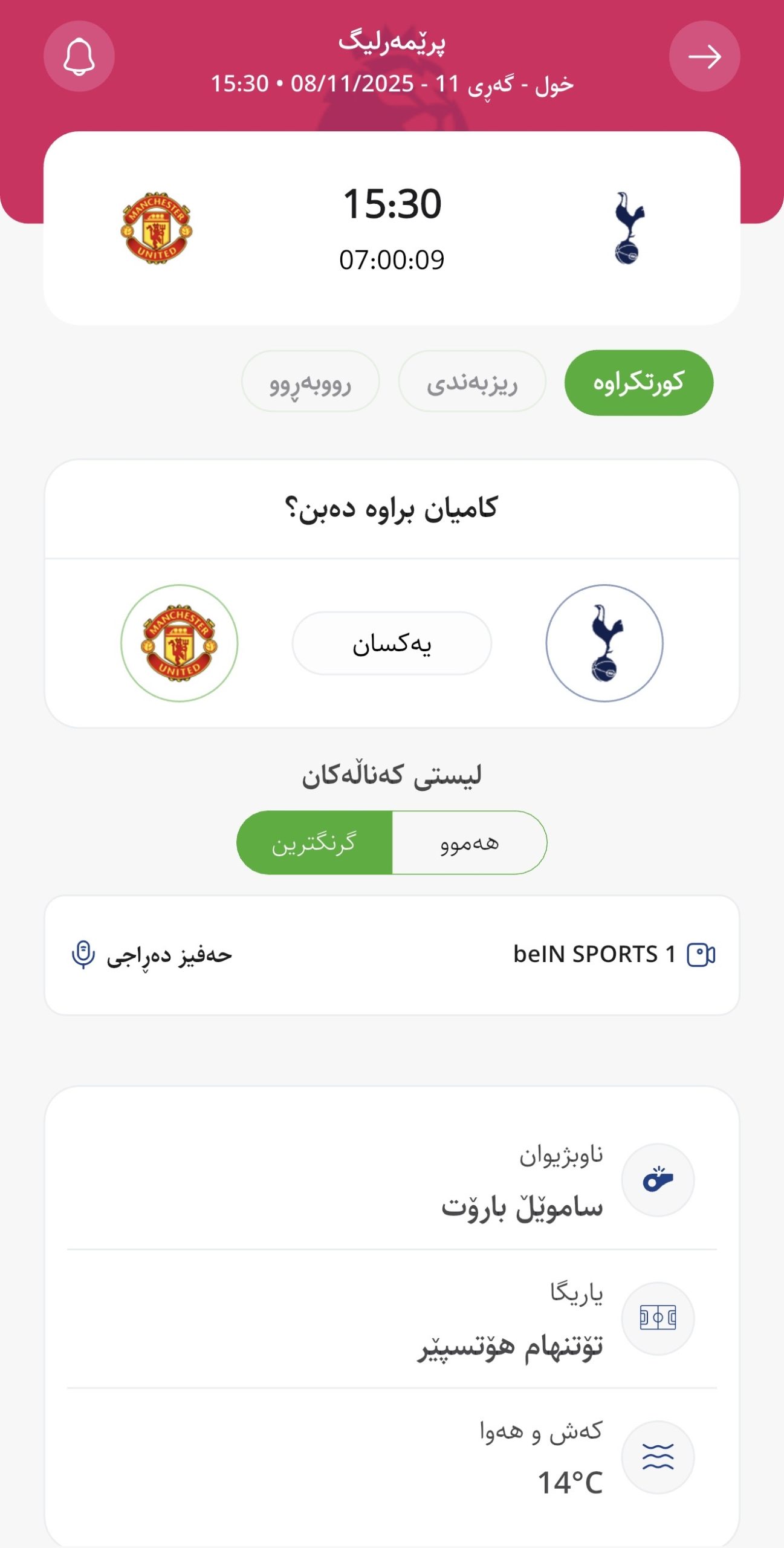 لە یەكەم یاریی گەڕی یازدەیەمی پرێمەرلیگ تۆتنهام لە یاریگای خۆیدا و لە یاریی لووتكەی ئەمڕۆدا میوانداری مانچێستەر یونایتد دەكات.