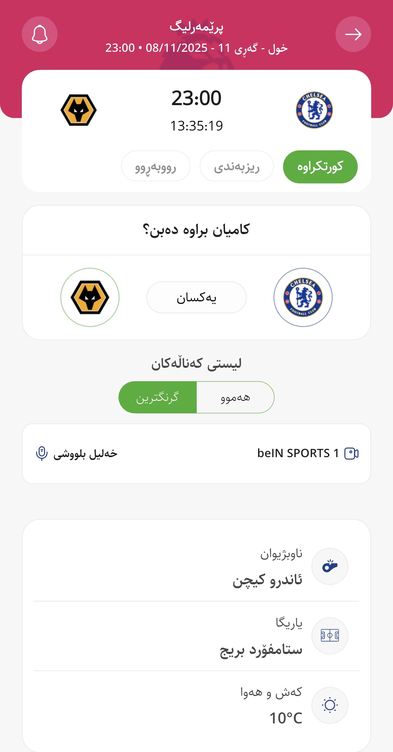 وا بڕیارە ئەمڕۆ شەممە كاتژمێر 23:00 چێڵسی لە یاریگای ستامفۆرد بریجی تایبەت بە خۆی میوانداری وۆڵڤز بكات، لە میانی یارییەكانی گەڕی یازدەیەمی پرێمەرلیگ.