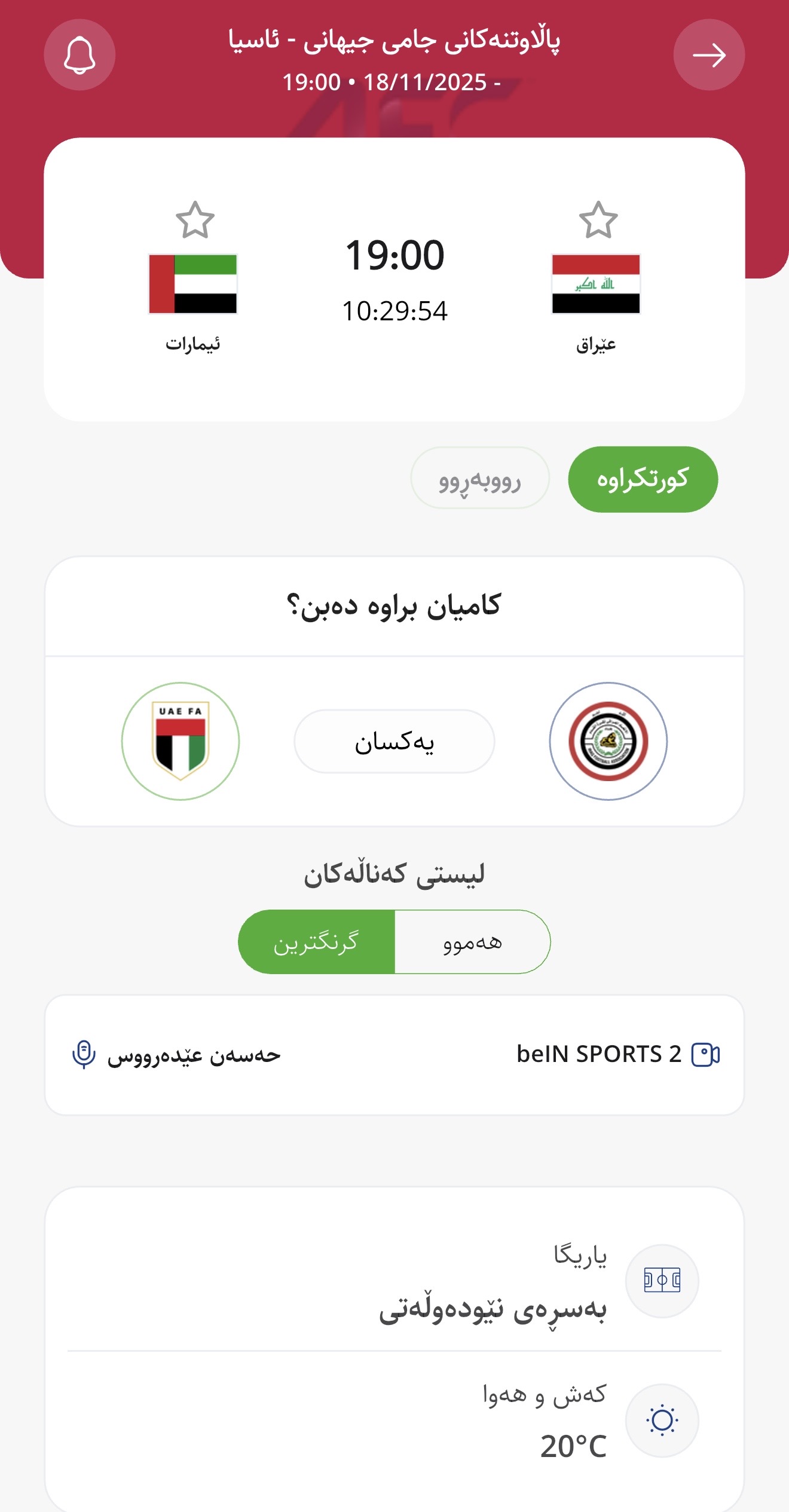 وا بڕیارە ئەمڕۆ سێشەممە كاتژمێر 19:00 بە كاتی كوردستان هەڵبژاردەی عێراق لە یاریگای بەسڕەی نێودەوڵەتی میوانداری هەڵبژاردەی ئیمارات بكات، لە میانی یارییەكانی پاشكۆی ئاسیا بۆ گەیشتن بە پاشكۆی جیهانی مۆندیالی 2026.