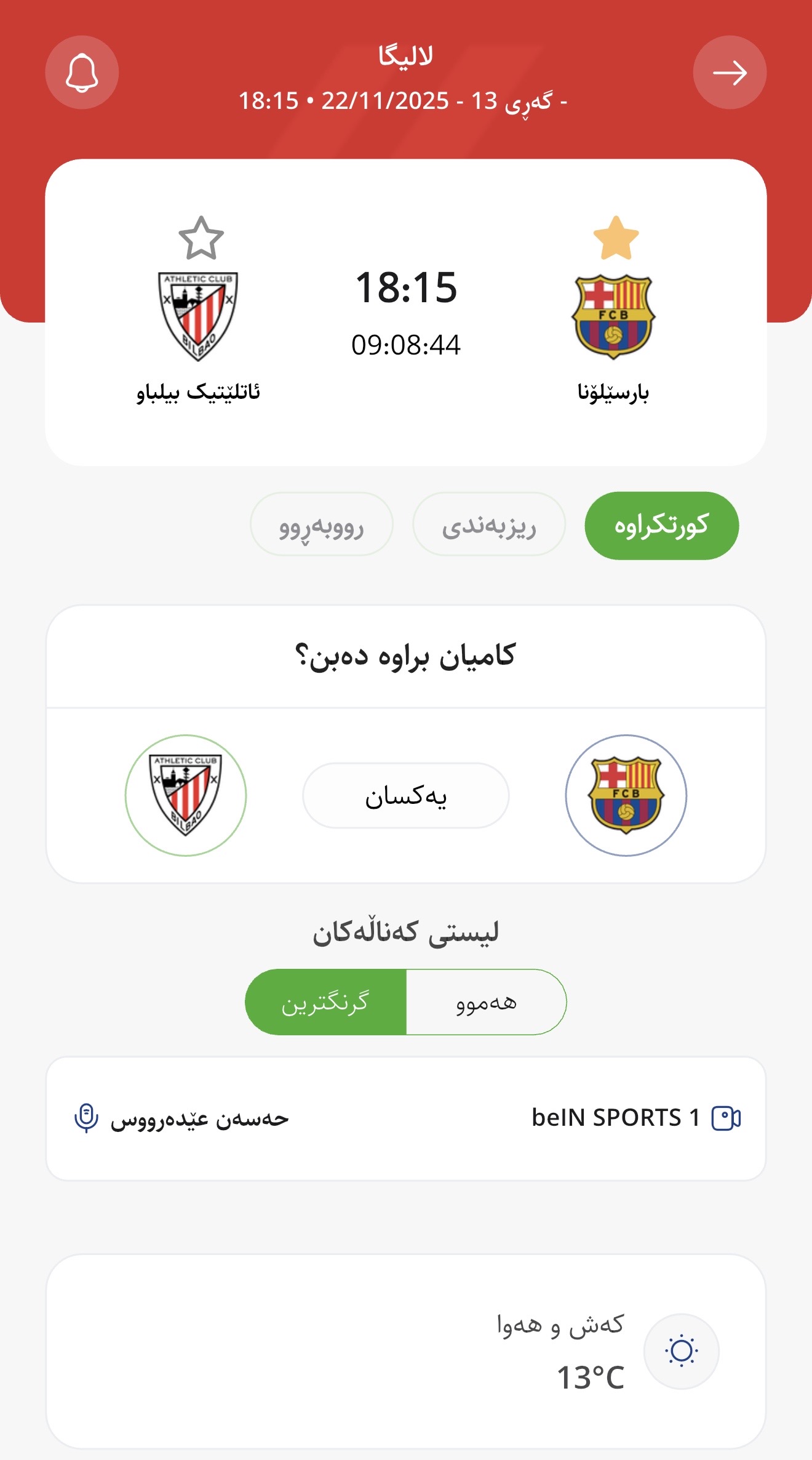 وا بڕیارە ئەمڕۆ كاتژمێر 18:15 بە كاتی هەولێر بارسێلۆنا لە یاریگای سپۆتیفای كامپ نۆو میوانداری ئاتلێتیک بیلباو بكات، لە میانی یارییەكانی گەڕی سیازدەیەمی لالیگای ئیسپانیا.
