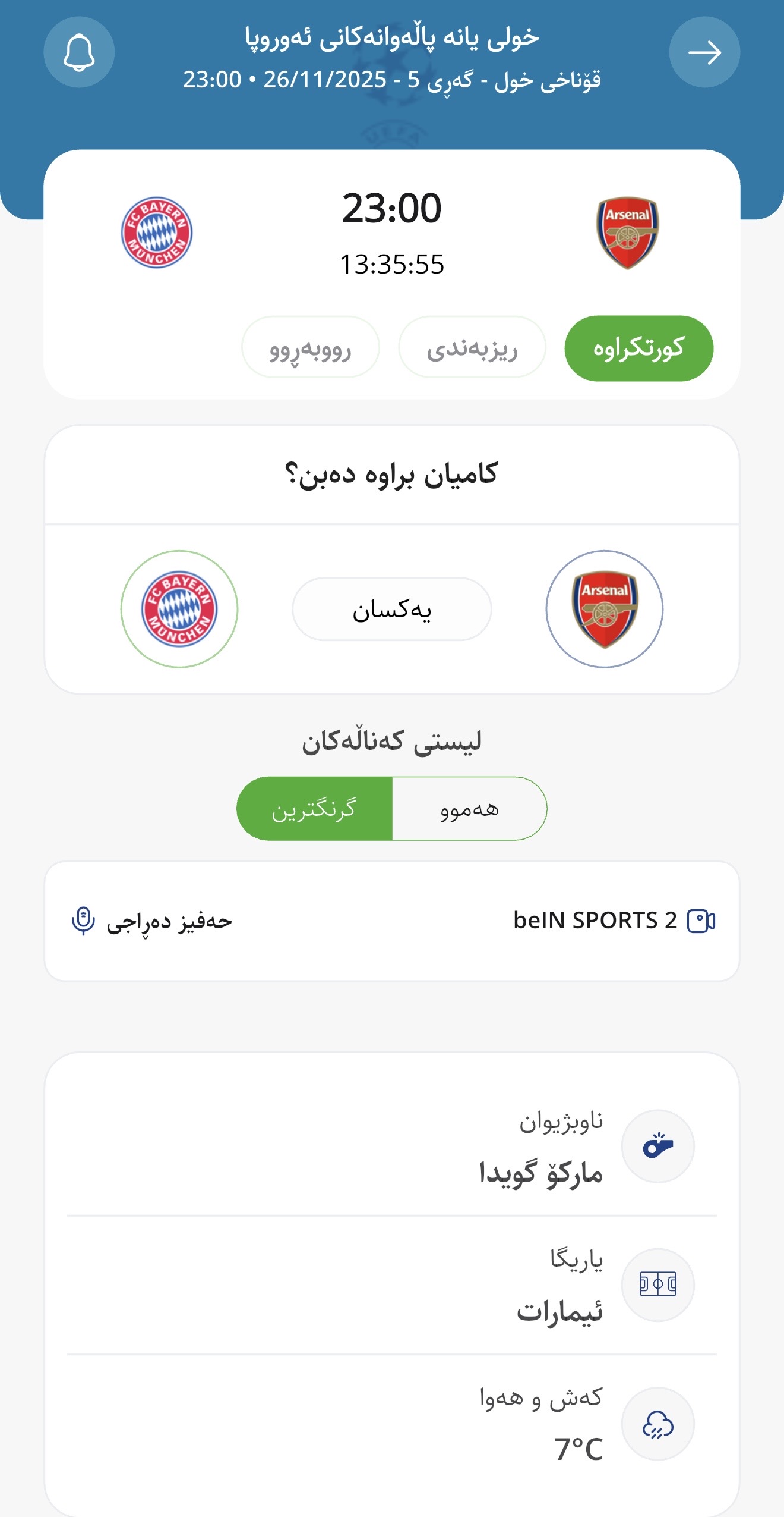 لە یاریی لووتكەی ئەمڕۆی چامپیۆنزلیگدا ئارسیناڵ لە یاریگای خۆیدا میوانداری بایرن میونشن دەكات.