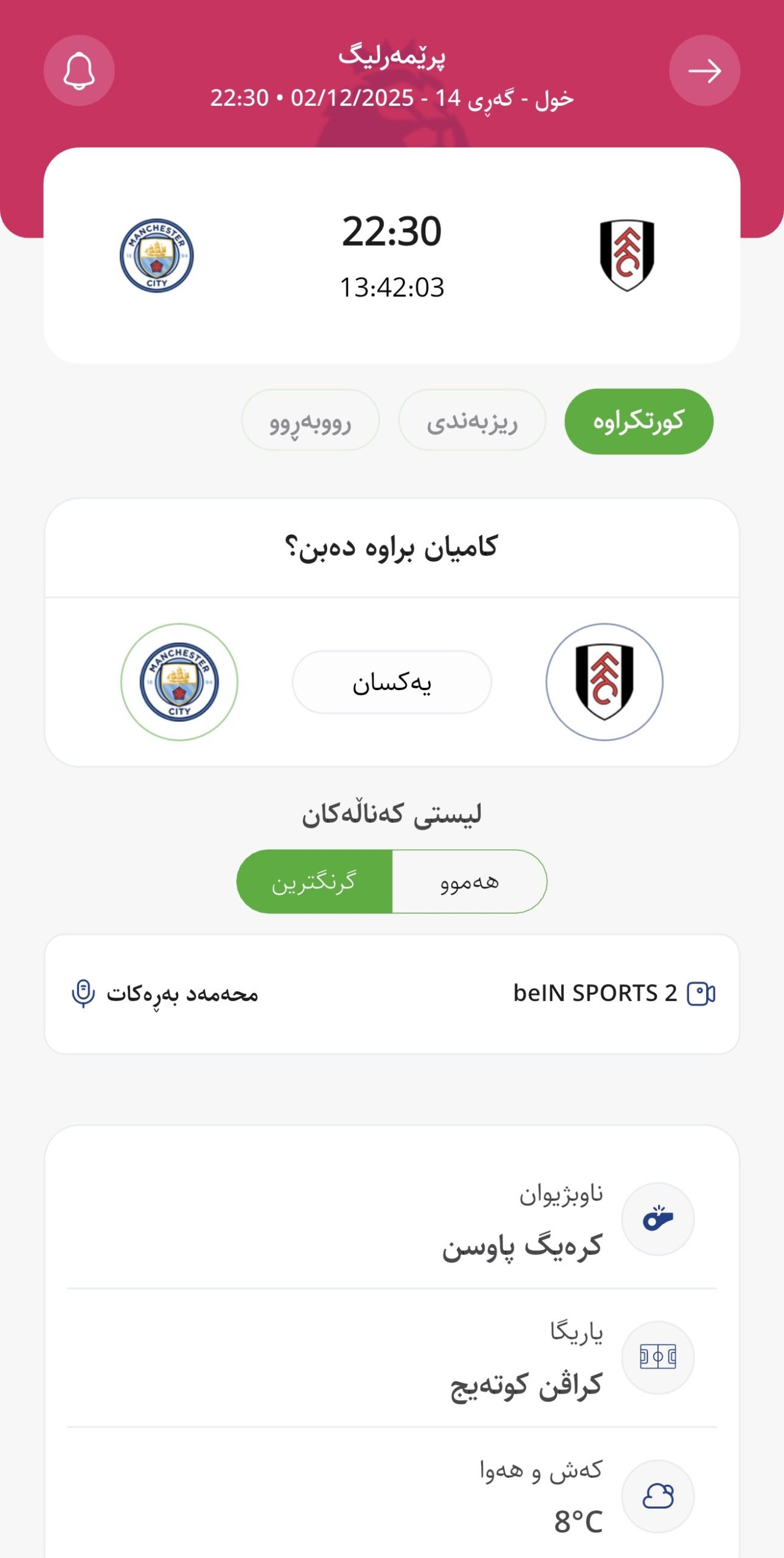 وا بڕیارە ئەمڕۆ سێشەممە كاتژمێر 22:30 بە كاتی هەولێر فولهام لە یاریگای كراڤن كوتەیجی تایبەت بە خۆی میوانداری مانچێستەر سیتی بكات، لە میانی یارییەكانی هەفتەی چواردەیەمی پرێمەرلیگ.