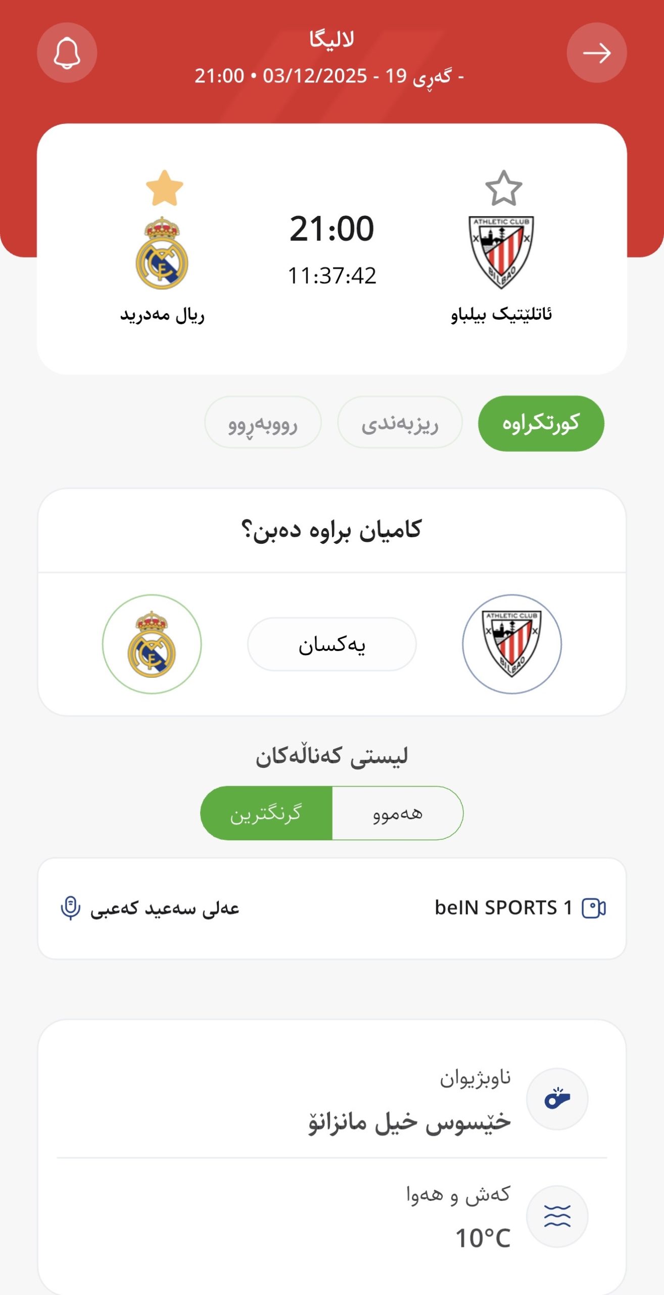 وا بڕیارە ئەمڕۆ چوارشەممە كاتژمێر 21:00 بە كاتی هەولێر ئاتلێتیک بیلباو لە یاریگای سان مامێسی تایبەت بە خۆی میوانداری ریال مەدرید بكات، لە میانی یاریی پێشخراوەی هەفتەی نۆزدەیەمی لالیگای ئیسپانیا.