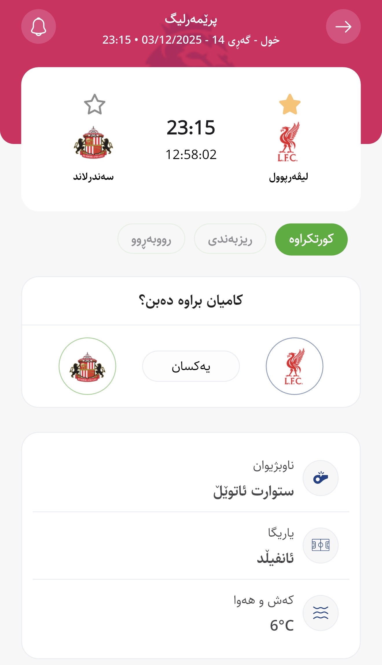 وا بڕیارە ئەمڕۆ چوارشەممە كاتژمێر 23:15 بە كاتی هەولێر لیڤەرپوول لە یاریگای ئانفیڵدی تایبەت بە خۆی میوانداری سەندرلاند بكات، لە میانی یارییەكانی هەفتەی چواردەیەمی پرێمەرلیگ.