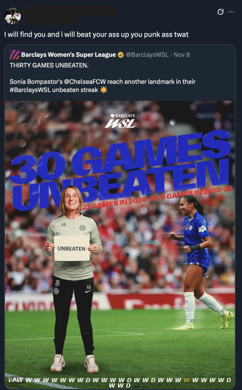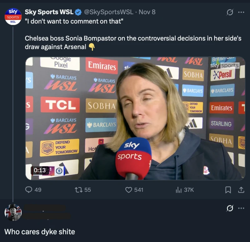 لەسەر ئاستی پرێمەرلیگی خانمانیش، سۆنیا بۆمپاستەر، راهێنەری خانمانی چێڵسی، زۆرترین قسەی نەشیاوی ئاڕاستەکراوە.
