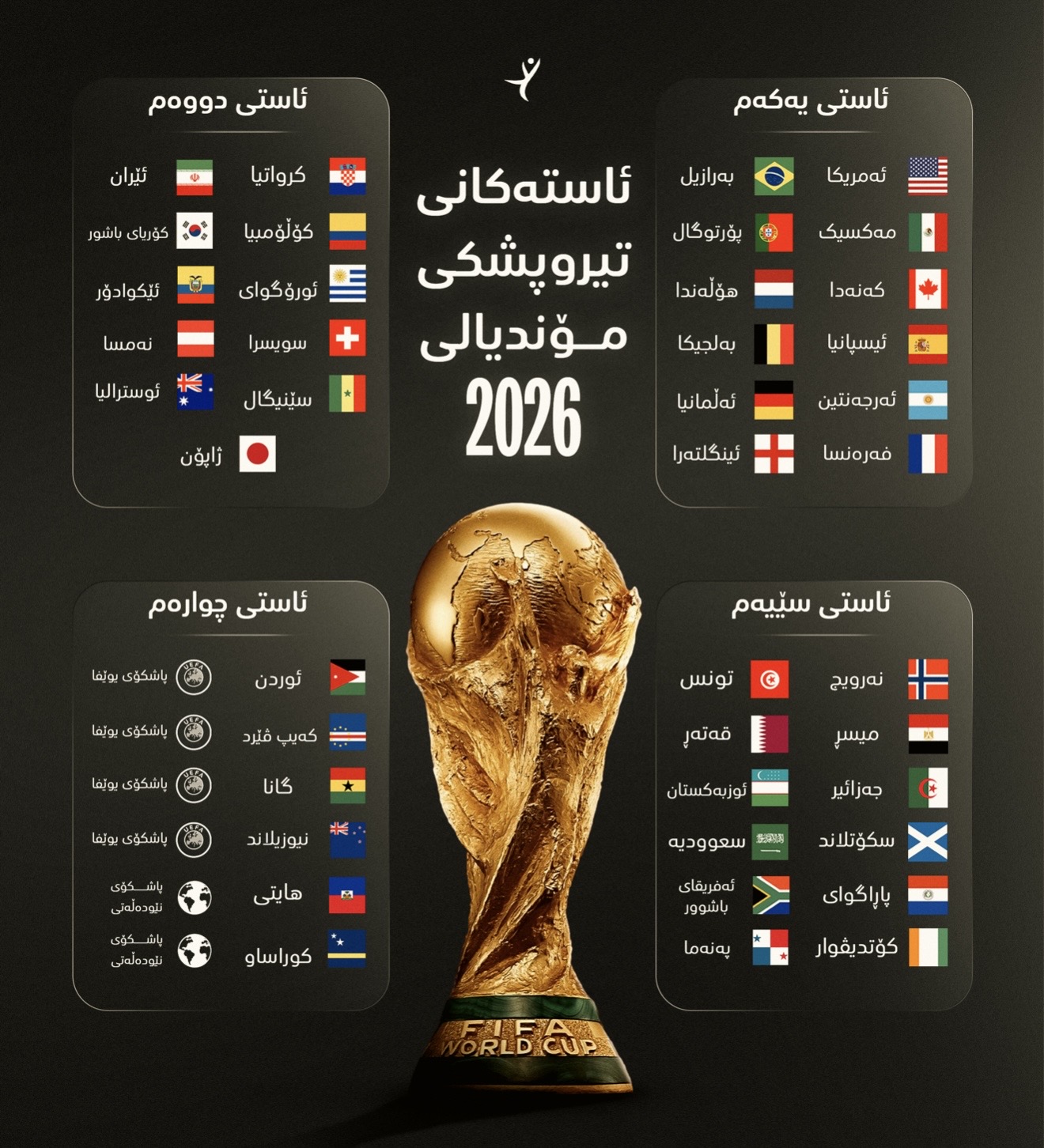 ئەمڕۆ هەینی كاتژمێر 20:00 بەكاتی هەولێر، رێوڕەسمی تیروپشكی جامی جیهانی 2026 لە ناوەندی كێنێدی لە واشنتنی پایتەختی ئەمریكا دەكرێت.