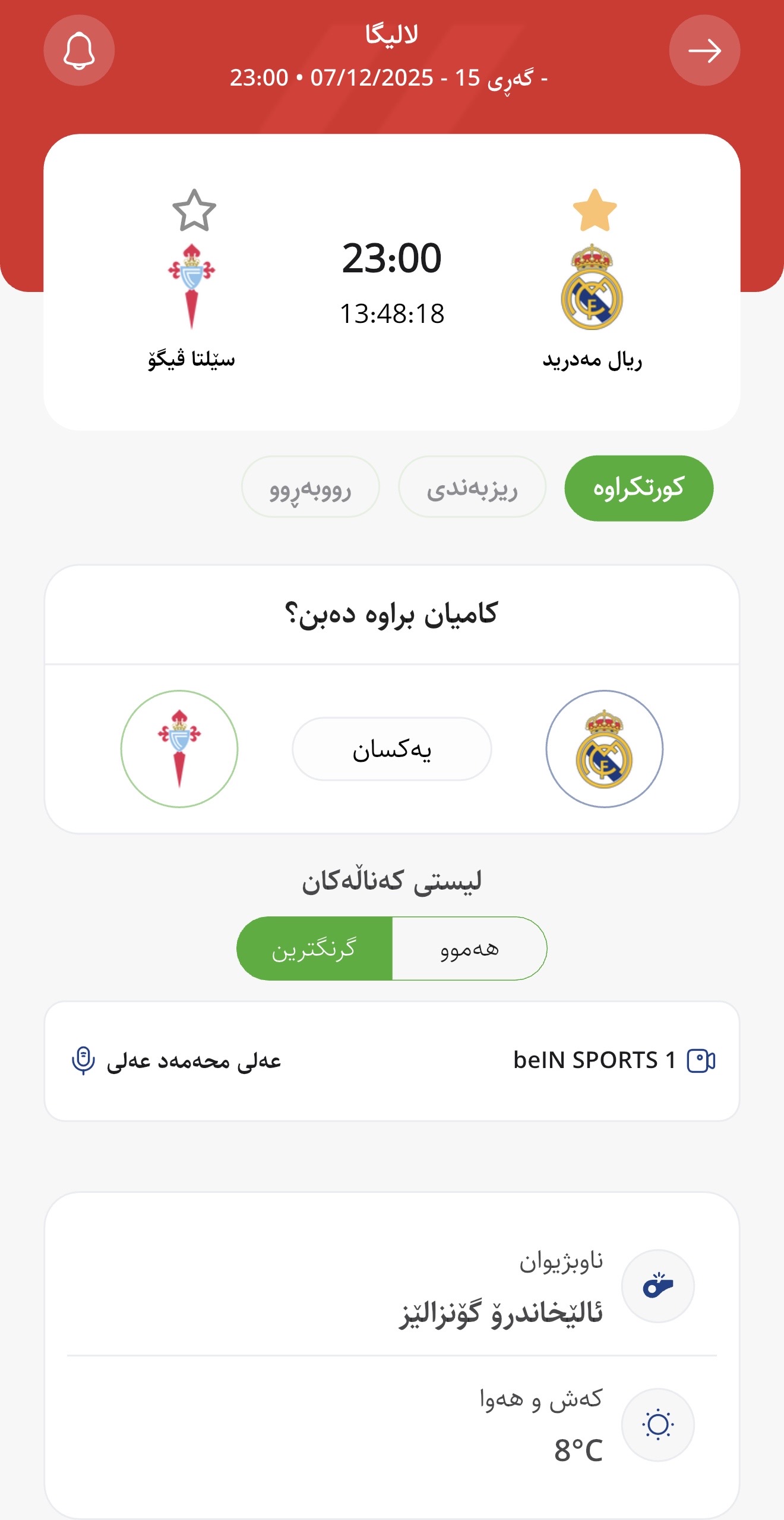 وا بڕیارە ئەمڕۆ یەكشەممە كاتژمێر 23:00 بە كاتی هەولێر ریال مەدرید لە یاریگای بێرنابیۆی تایبەت بە خۆی میوانداری سێلتا ڤیگۆ بكات، لە میانی یارییەكانی گەڕی پازدەی لالیگای ئیسپانیا.