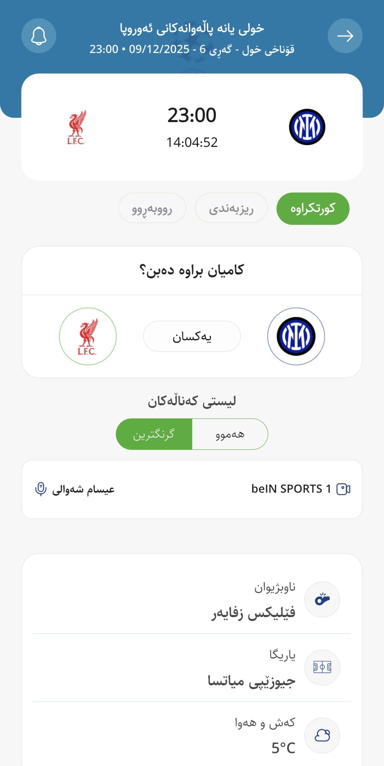 وا بڕیارە ئەمڕۆ سێشەممە كاتژمێر 23:00 بە كاتی هەولێر ئینتەر میلان لە یاریگای جیۆزێپی میاتسا میوانداری لیڤەرپوول بكات، لە میانی یارییەكانی گەڕی شەشەمی قۆناخی خول – چامپیۆنزلیگ.