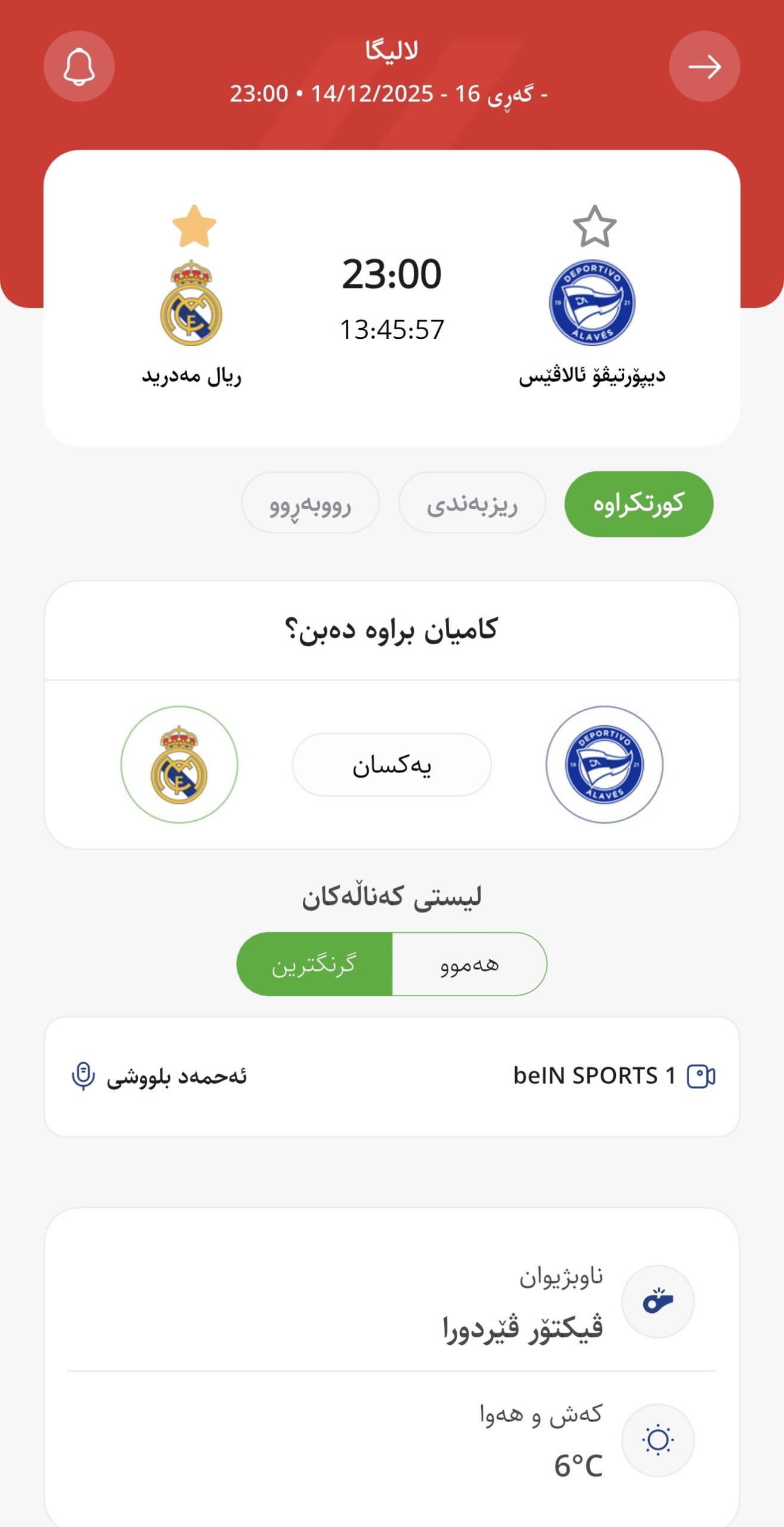 وا بڕیارە ئەمڕۆ یەكشەممە كاتژمێر 23:00 بە كاتی هەولێر دیپۆرتیڤۆ ئالاڤێس لە یاریگای خۆیدا میوانداری ریال مەدرید بكات، لە میانی یارییەكانی گەڕی شازدەی لالیگای ئیسپانیا.