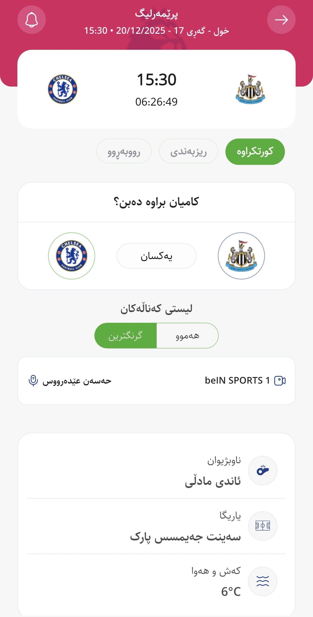 وا بڕیارە ئەمڕۆ شەممە كاتژمێر 15:30 بە كاتی هەولێر نیوكاسڵ لە یاریگای سەینت جەیمس پاركی تایبەت بە خۆی میوانداری چێڵسی بكات، لە میانی یارییەكانی گەڕی 17 پرێمەرلیگ.