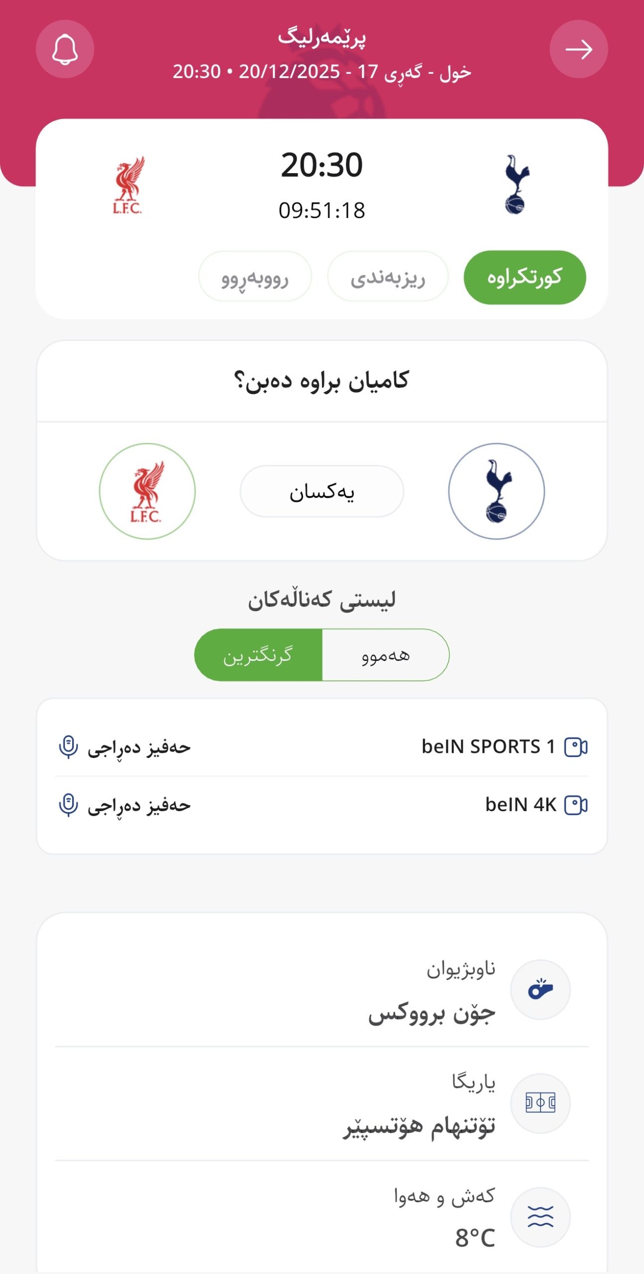 وا بڕیارە ئەمڕۆ شەممە كاتژمێر 20:30 بە كاتی هەولێر تۆتنهام لە یاریگای تایبەت بە خۆی میوانداری لیڤەرپوول بكات، لە میانی یارییەكانی گەڕی 17ی پرێمەرلیگ.