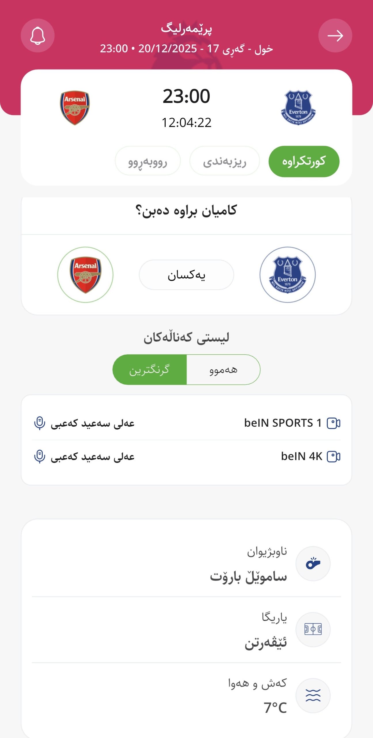 وا بڕیارە ئەمڕۆ شەممە كاتژمێر 23:00 بە كاتی هەولێر ئێڤەرتن لە یاریگای خۆیدا میوانداری ئارسیناڵ بكات، لە میانی یارییەكانی گەڕی 17 پرێمەرلیگ.