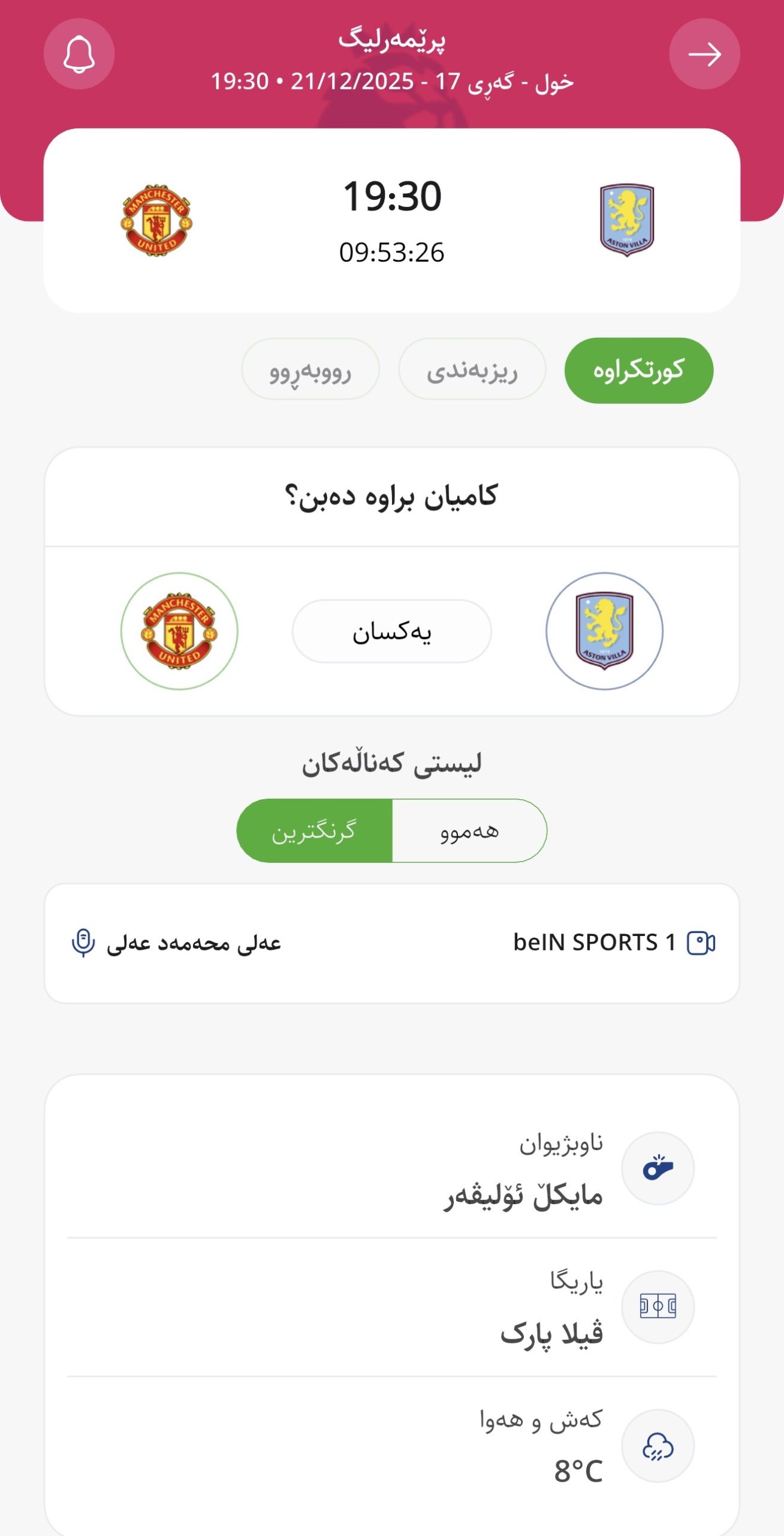 وابڕیارە ئەمڕۆ یەكشەممە كاتژمێر 19:30 بە كاتی هەولێر ئاستۆن ڤیلا لە یاریگای ڤیلا پاركی تایبەت بە خۆی میوانداری مانچێستەر یونایتد بكات، لە میانی یارییەكانی گەڕی حەڤدەیەمی پرێمەرلیگ.