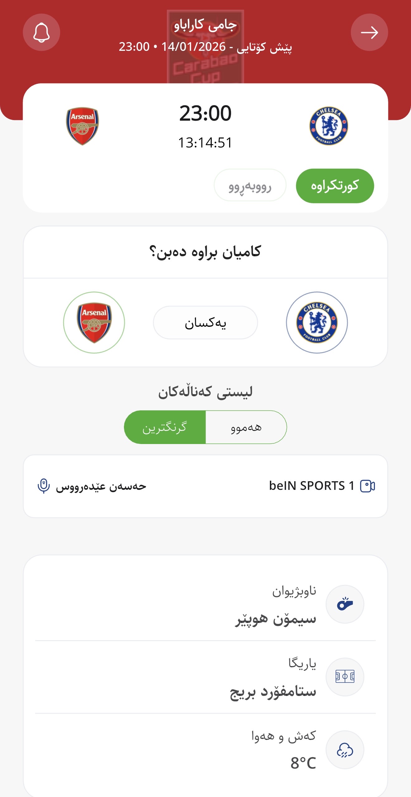 وا بڕیارە ئەمڕۆ چوارشەممە كاتژمێر 23:00 بە كاتی هەولێر چێڵسی لە یاریگای ستامفۆرد بریجی تایبەت بە خۆی میوانداری ئارسیناڵ بكات، لە میانی یاریی چوونی قۆناخی پێش كۆتایی جامی كاراباو.
