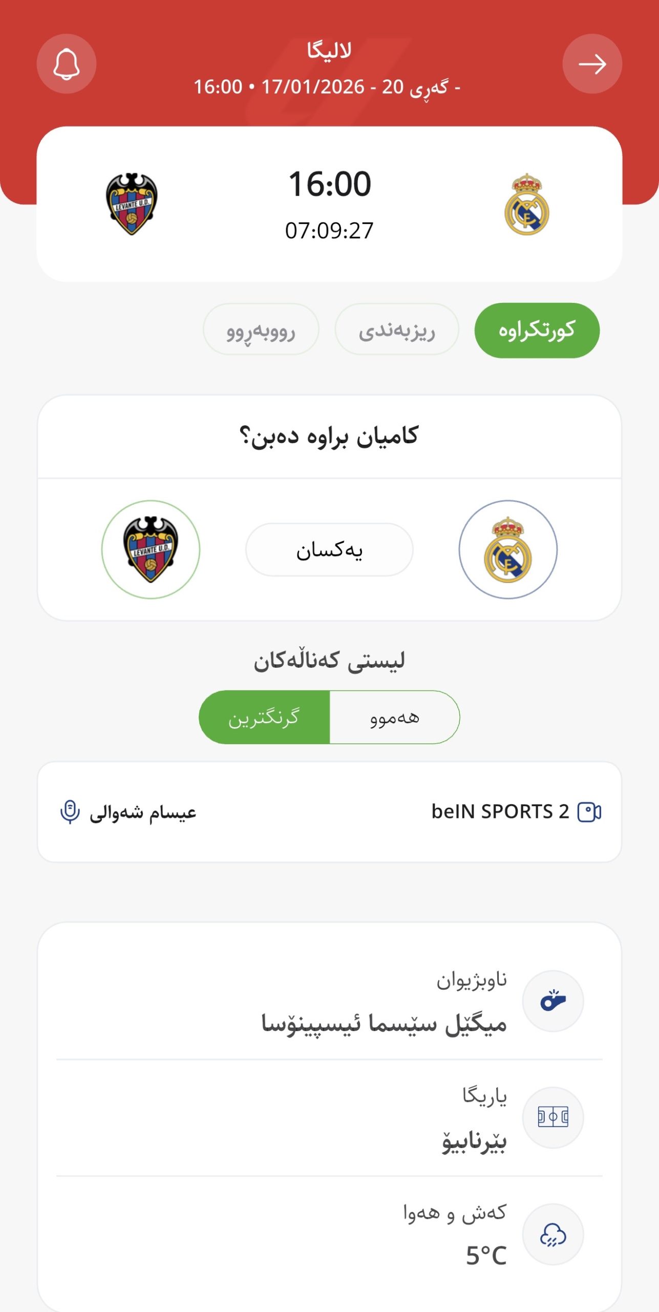 وا بڕیارە ئەمڕۆ شەممە كاتژمێر 16:00 بە كاتی هەولێر ریال مەدرید لە یاریگای بێرنابیۆی تایبەت بە خۆی میوانداری لێڤانتێ بكات، لە میانی یارییەكانی گەڕی بیستەمی لالیگای ئیسپانیا.