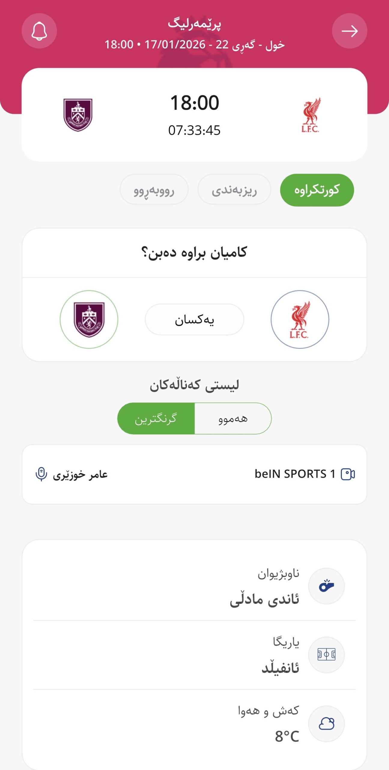 وابڕیارە ئەمڕۆ شەممە كاتژمێر 18:00 بەكاتی هەولێر لیڤەرپوول لە یاریگای ئانفیڵدی تایبەت بە خۆی میوانداری بێرنلی بكات، لە میانی یارییەكانی گەڕی 22ی پرێمەرلیگ.