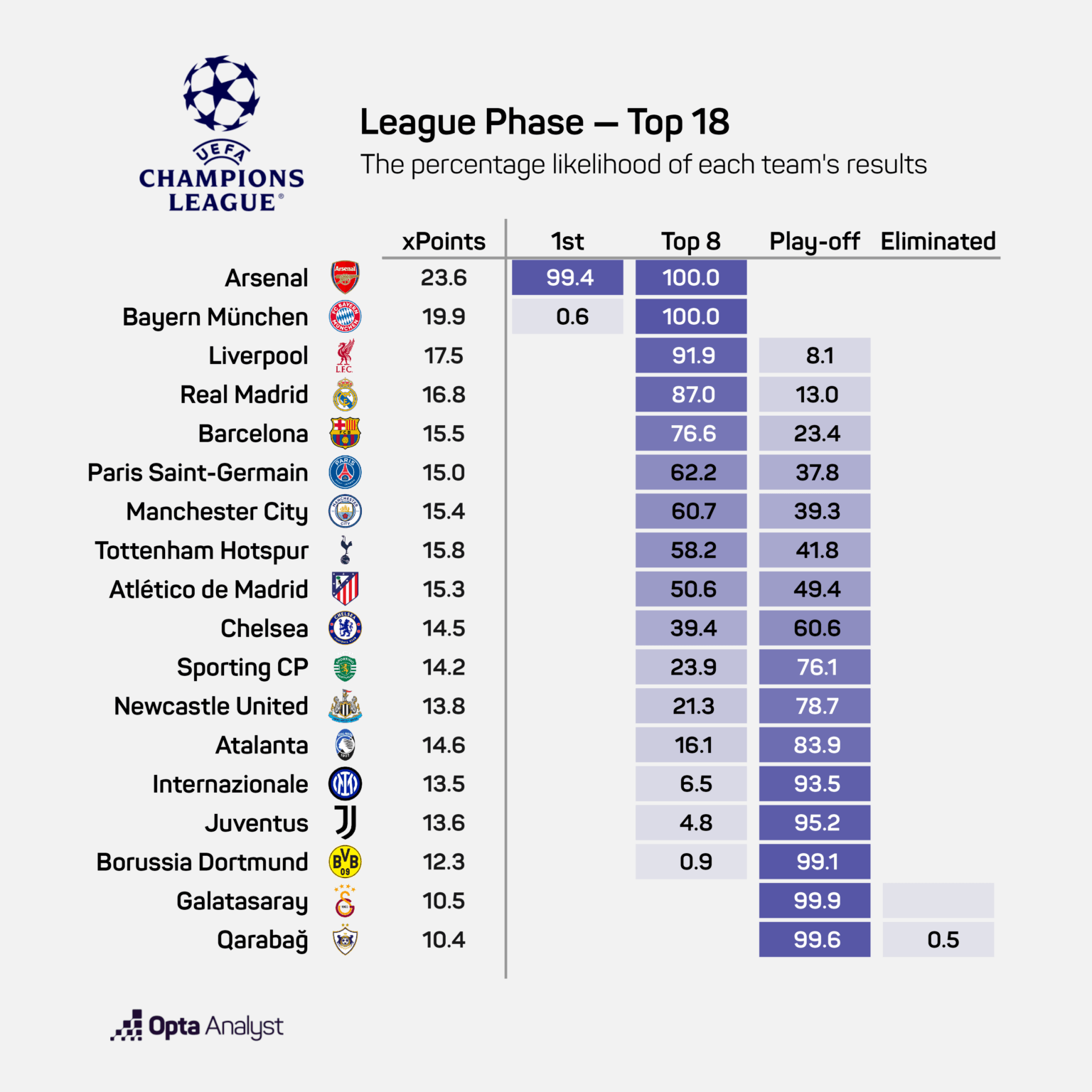 بەپێی سوپەر کۆمپیوتەری ئۆپتا، 15 یانە دەرفەتی زیاتر لە 50%ـیان هەیە بگەنە پاشکۆی چامپیۆنزلیگ. ئەو یانانەی بە نزیکەیی قۆناخەکەیان مسۆگەرکردووە ئەمانەن؛