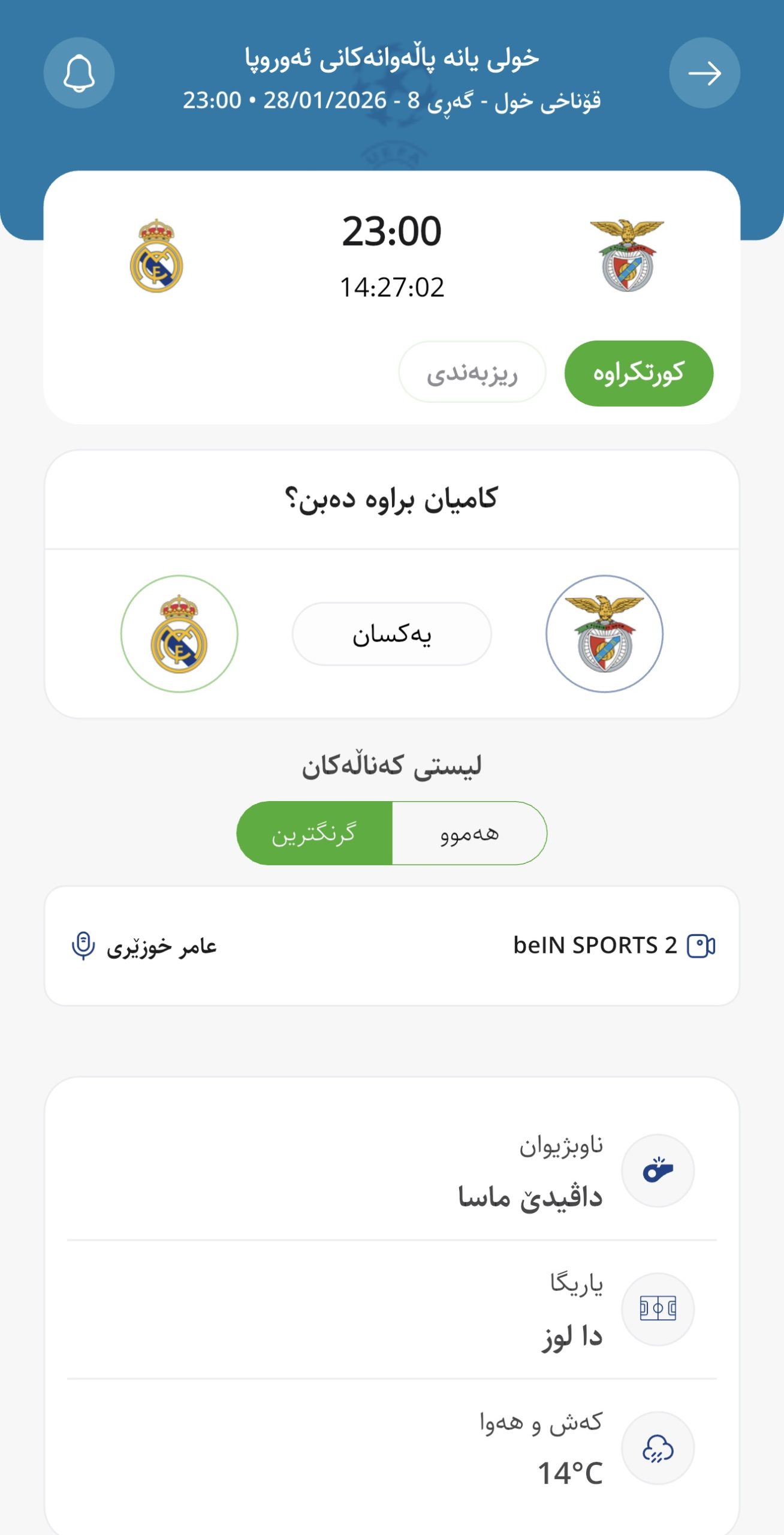وا بڕیارە ئەمڕۆ چوارشەممە كاتژمێر 23:00 بەكاتی هەولێر بێنفیكای پۆرتوگالی لە یاریگای خۆیدا میوانداری ریال مەدریدی ئیسپانی بكات، لە میانی یارییەكانی گەڕی هەشتەمی قۆناخی خول – چامپیۆنزلیگ.