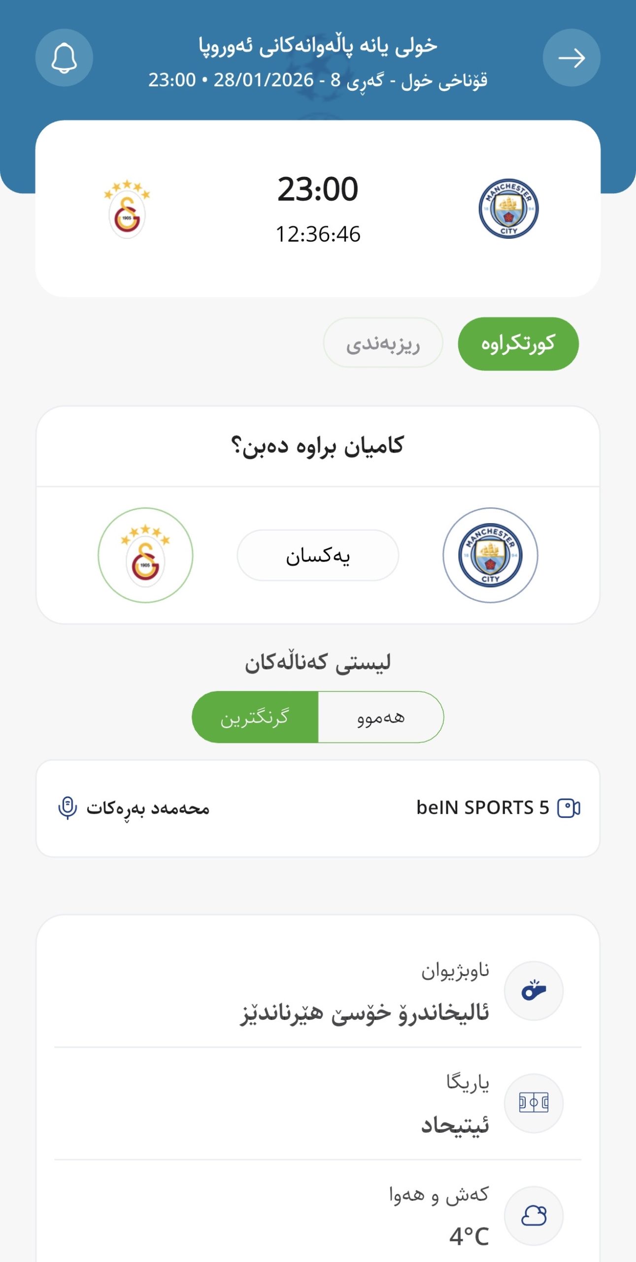 وابڕیارە ئەمڕۆ چوارشەممە كاتژمێر 23:00 بە كاتی هەولێر مانچێستەر سیتی لە یاریگای ئیتیحادی تایبەت بە خۆی میوانداری گاڵاتاسەرای بكات، لە میانی یارییەكانی گەڕی هەشتەمی قۆناخی خول – چامپیۆنزلیگ.