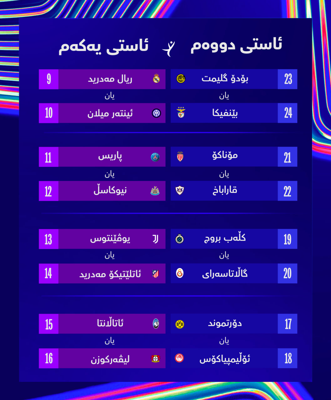 تیپەکانی پلەی 9 و 10، رووبەڕووی تیپەکانی پلەی 23 و 24 دەبنەوە.