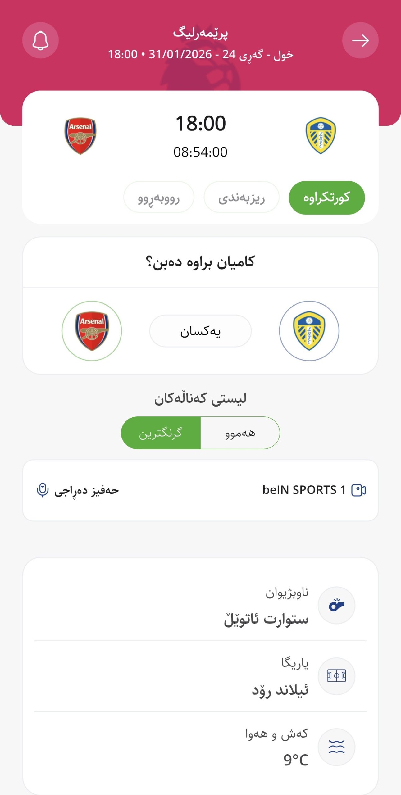 وابڕیارە ئەمڕۆ شەممە كاتژمێر 18:00 بە كاتی هەولێر لیدز یونایتد لە یاریگای خۆیدا میوانداری ئارسیناڵ دەكات، لە میانی یارییەكانی گەڕی 24 پرێمەرلیگ.