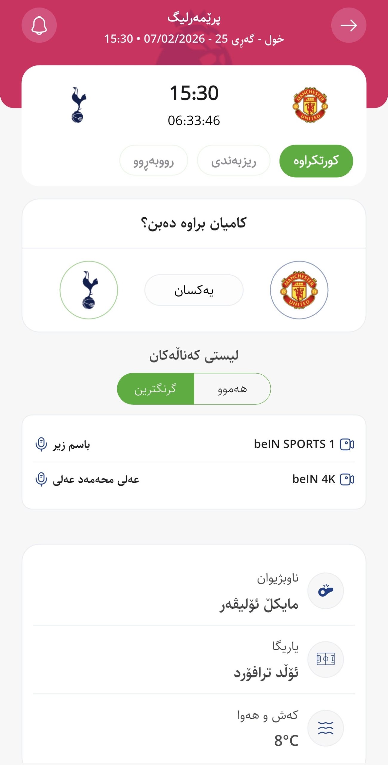 وا بڕیارە ئەمڕۆ شەممە كاتژمێر 15:30 بە كاتی هەولێر مانچێستەر یونایتد لە یاریگای ئۆڵد ترافۆردی تایبەت بە خۆی میوانداری تۆتنهام بكات، لە میانی یارییەكانی گەڕی 25 پرێمەرلیگ.