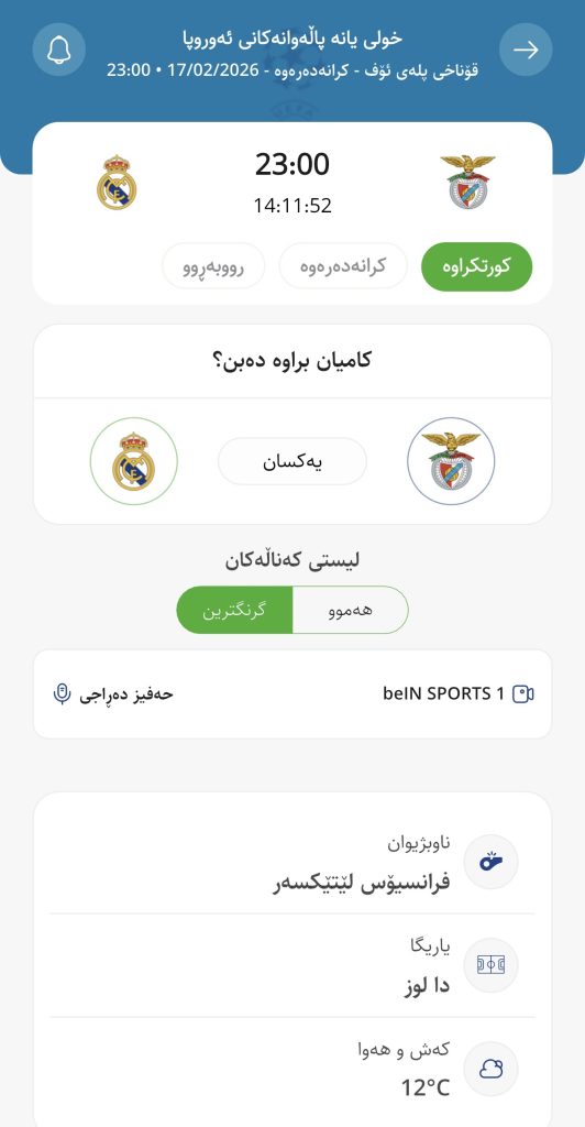 وابڕیارە ئەمڕۆ سێشەممە كاتژمێر 23:00 بە كاتی هەولێر بێنفیكا لە یاریگای دا لوزی تایبەت بە خۆی میوانداری ریال مەدرید دەكات، لە میانی یاریی چوونی قۆناخی پلەی ئۆفی چامپیۆنزلیگ.