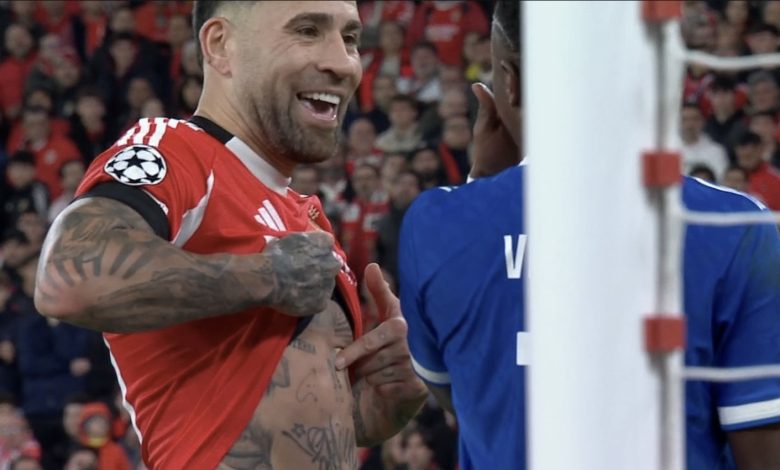 نیكۆلاس ئۆتامێندی، بەرگریكاری ئەرجەنتینی یانەی بێنفیكای پۆرتوگالی بە وێنەی مێسی و مۆندیال هەوڵی توڕەكردنی ڤینیسیۆس جونیۆر دەدات.