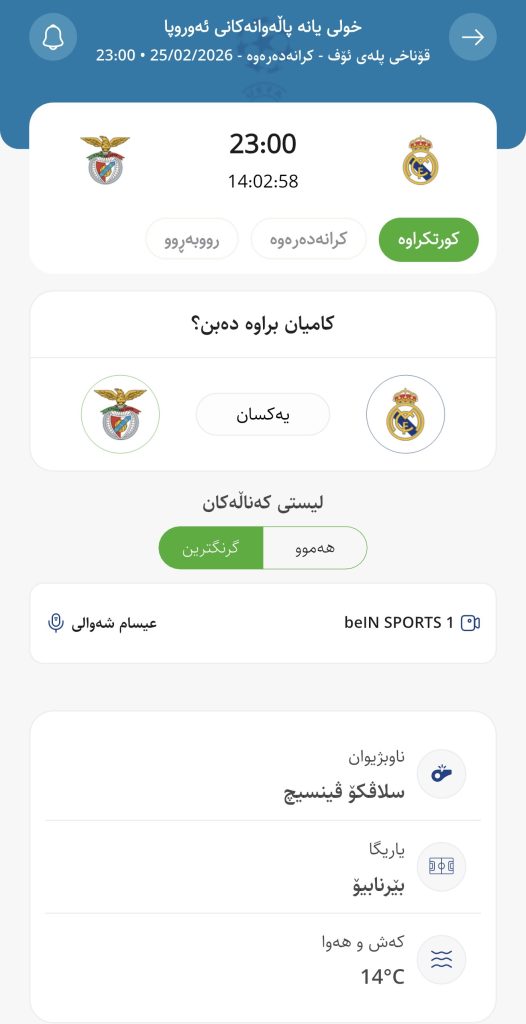 وابڕیارە ئەمڕۆ چوارشەممە كاتژمێر 23:00 بە كاتی هەولێر ریال مەدرید لە یاریگای بێرنابیۆی تایبەت بە خۆی میوانداری بێنفیكا بكات، لە میانی یارییەكانی قۆناخی پاشكۆی گەیشتن بە قۆناخی شازدەی چامپیۆنزلیگ.