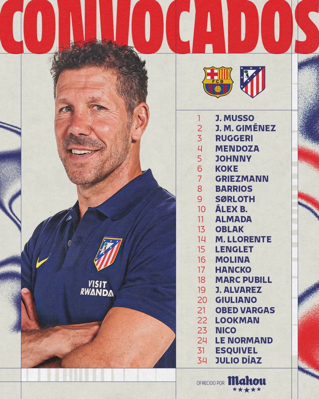 ئاتلێتیکۆ مەدرید لیستی یاریزانە بانگێشتکراوەکانی بۆ یارییە گەورەکەی ئەمشەو بەرامبەر بارسێلۆنا بڵاوکردەوە.