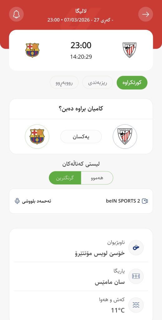 وا بڕیارە ئەمڕۆ شەممە كاتژمێر 23:00 بەكاتی هەولێر ئاتلێتیک بیلباو لە یاریگای سان مامێسی تایبەت بە خۆی میوانداری بارسێلۆنا بكات، لە میانی یارییەكانی گەڕی 27 لالیگای ئیسپانیا.