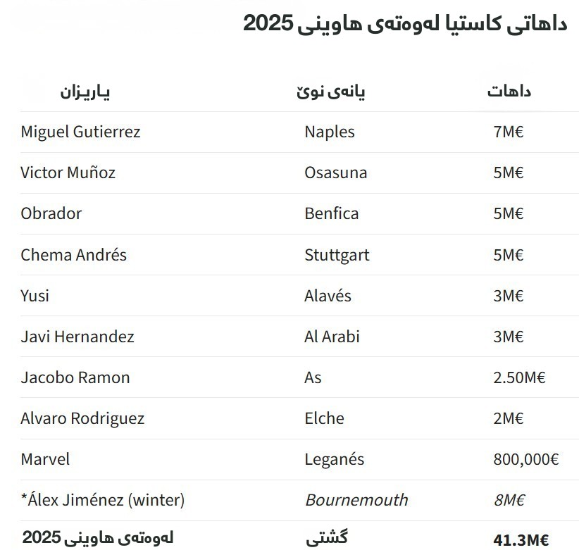 ئەم وەرزە کاستیا بە تێکڕای تەمەنی 20.2 لاوترین تیمی خولی پلە سێی ئیسپانیایە. هەر بەگوێرەی رۆژنامەی ئاس، ئەگەر یانەکە بیوستبایە تاوەکوو ئێستا 40%ـی کاستیا فرۆشرابوو. ئۆفەرەکان بەردەستن بەڵام تاوەکوو ئێستا هیچ بڕیارێک نەدراوە. بۆ نموونە دیێگۆ ئاگوادۆ؛ بۆروسیا دۆرتموند وەرزی رابردوو شەش ملیۆن یۆرۆی بۆ گواستنەوەی پێشکەش کرد. فۆرتیا چەند یانەیەکی گەورە گرنگی پێدەدەن و پێش ئەوەی گرێبەستەکەی نوێ بکاتەوە دوو تیمی چامپیۆنزلیگی رەتکردەوە.