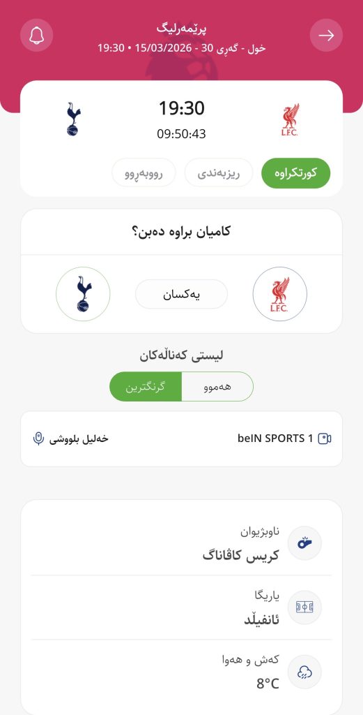 وابڕیارە ئەمڕۆ یەكشەممە كاتژمێر 19:30 بەكاتی هەولێر لیڤەرپوول لە یاریگای ئانفیڵدی تایبەت بە خۆی میوانداری تۆتنهام بكات، لە میانی یارییەكانی هەفتەی 30 پرێمەرلیگ.
