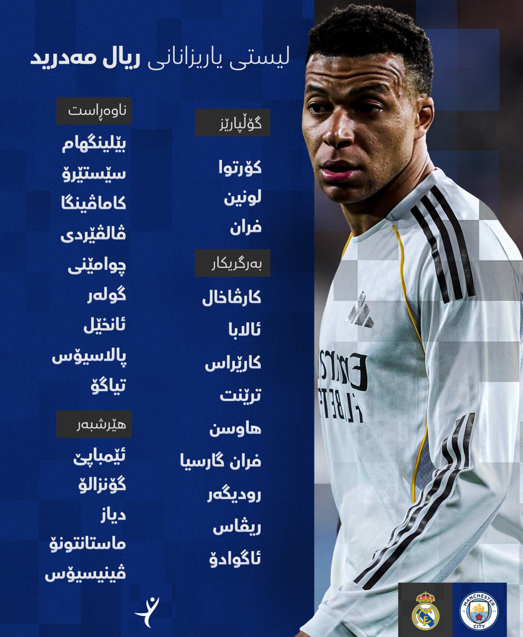 سبەی سێشەممە 17ـی ئازاری 2026 ریال مەدرید لە یاریی گەڕانەوە قۆناخی شازدەی چامپیۆنزلیگ لە یاریگای ئیتیحاد دەبێتە میوانی مانچێستەر سیتی.